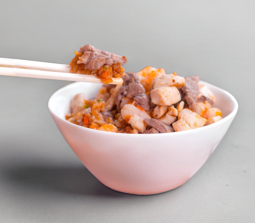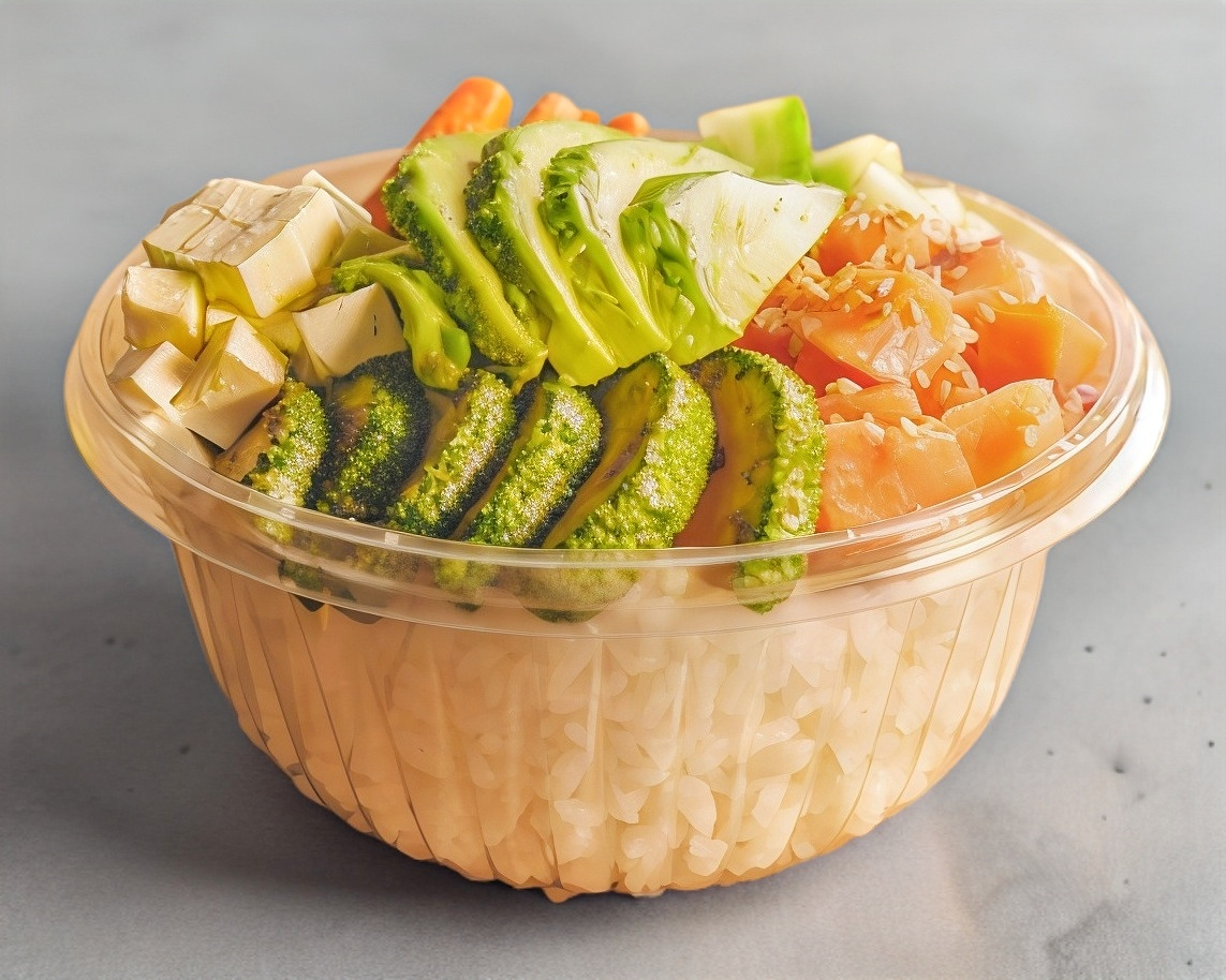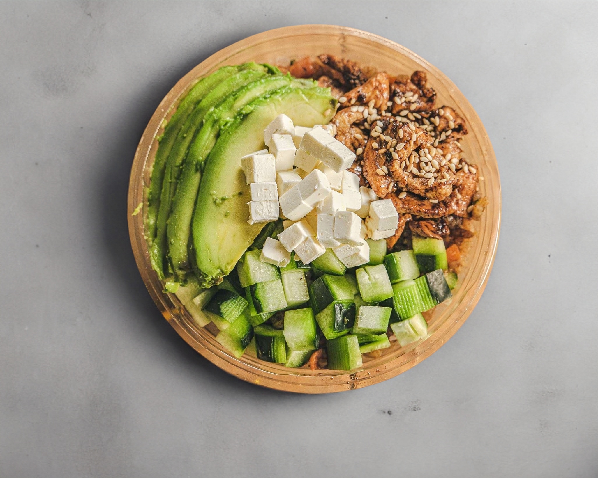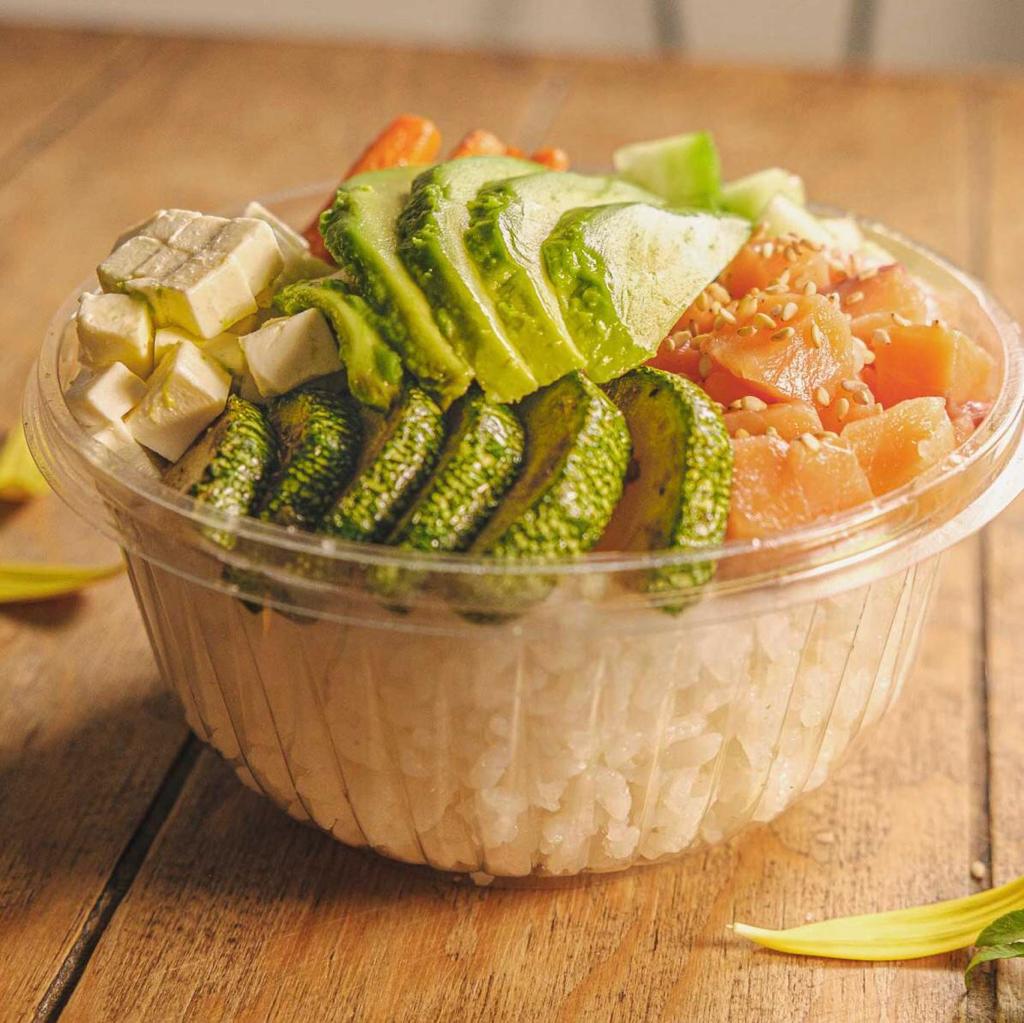 Salmón, arroz al vapor, verduras salteadas, pepino, queso philadelphia y aguacate.