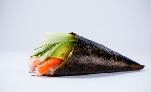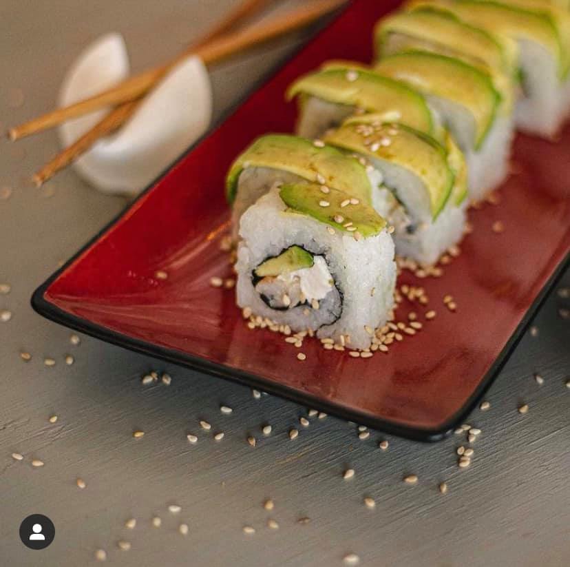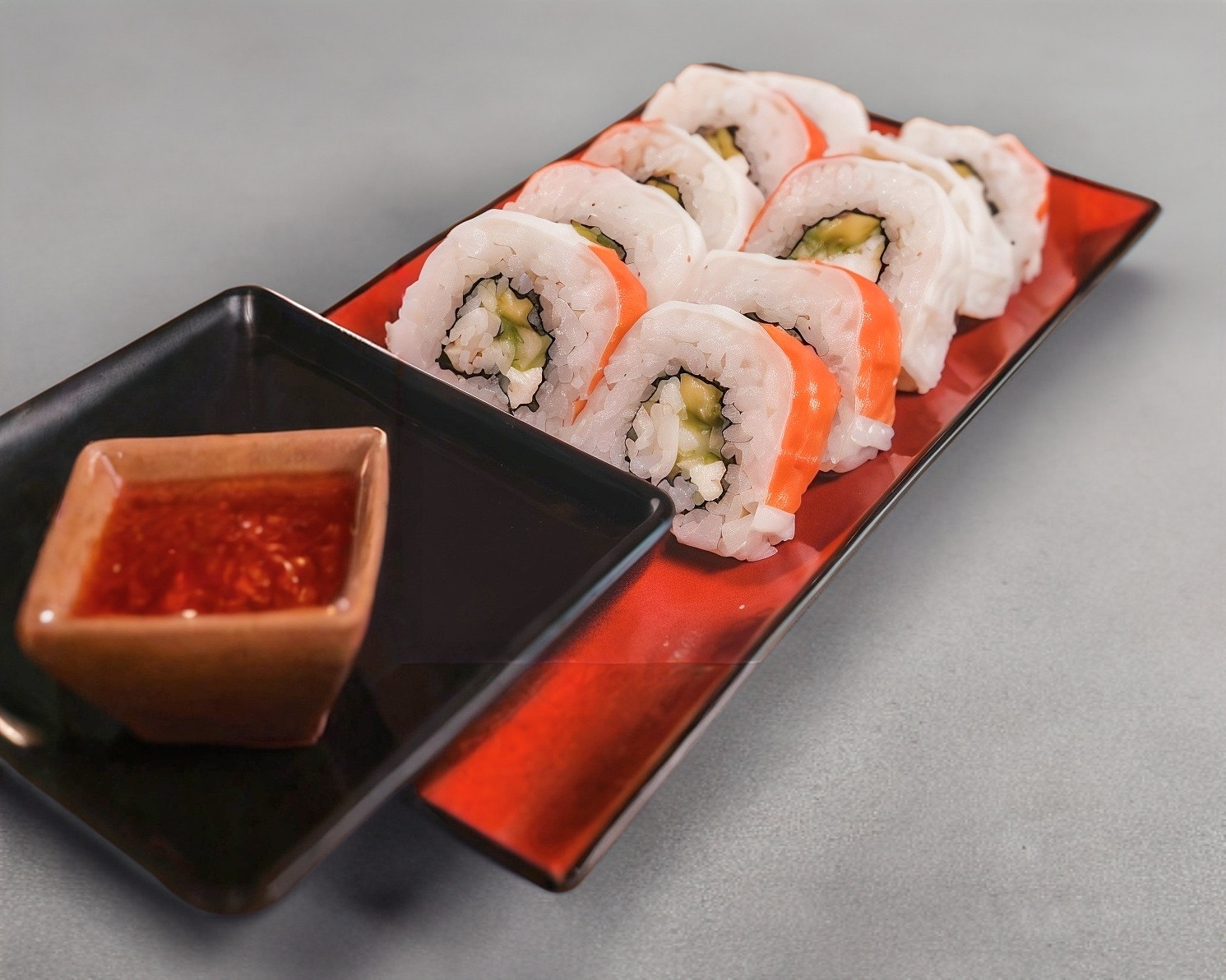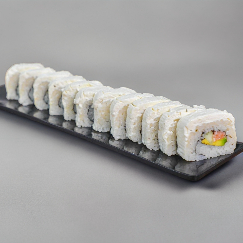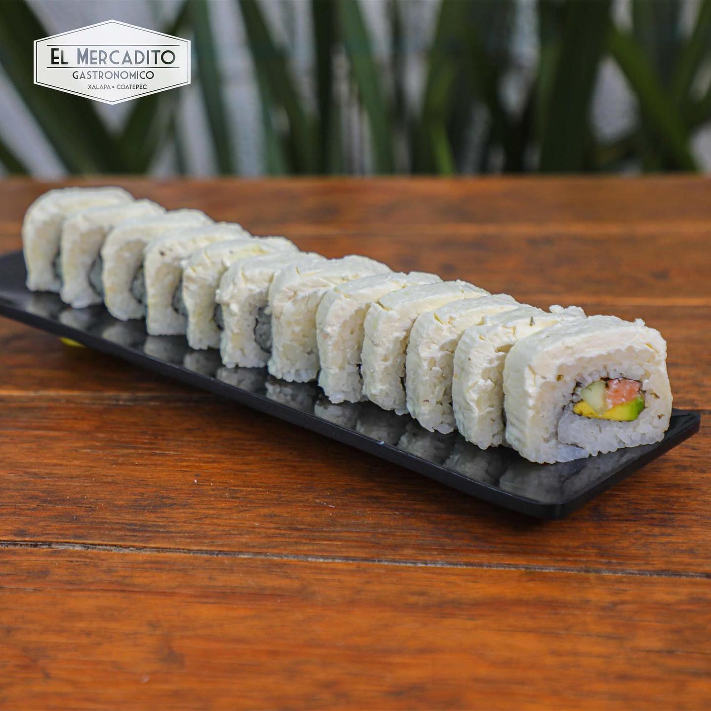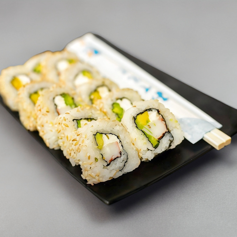 Surimi, queso philadelphia, aguacate y cubierto de ajonjolí.