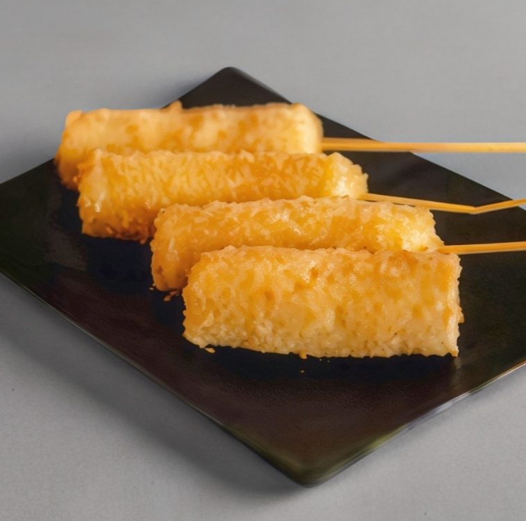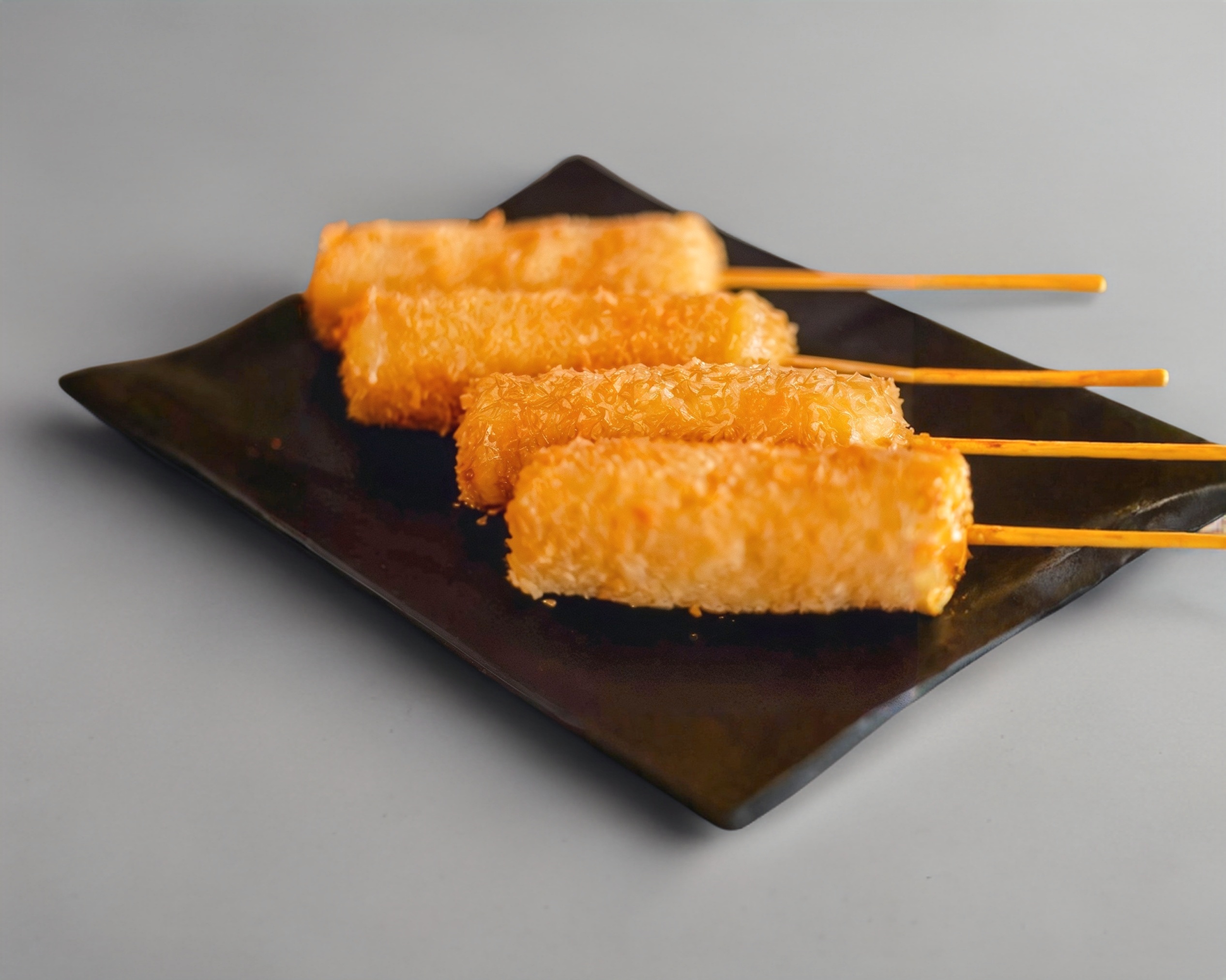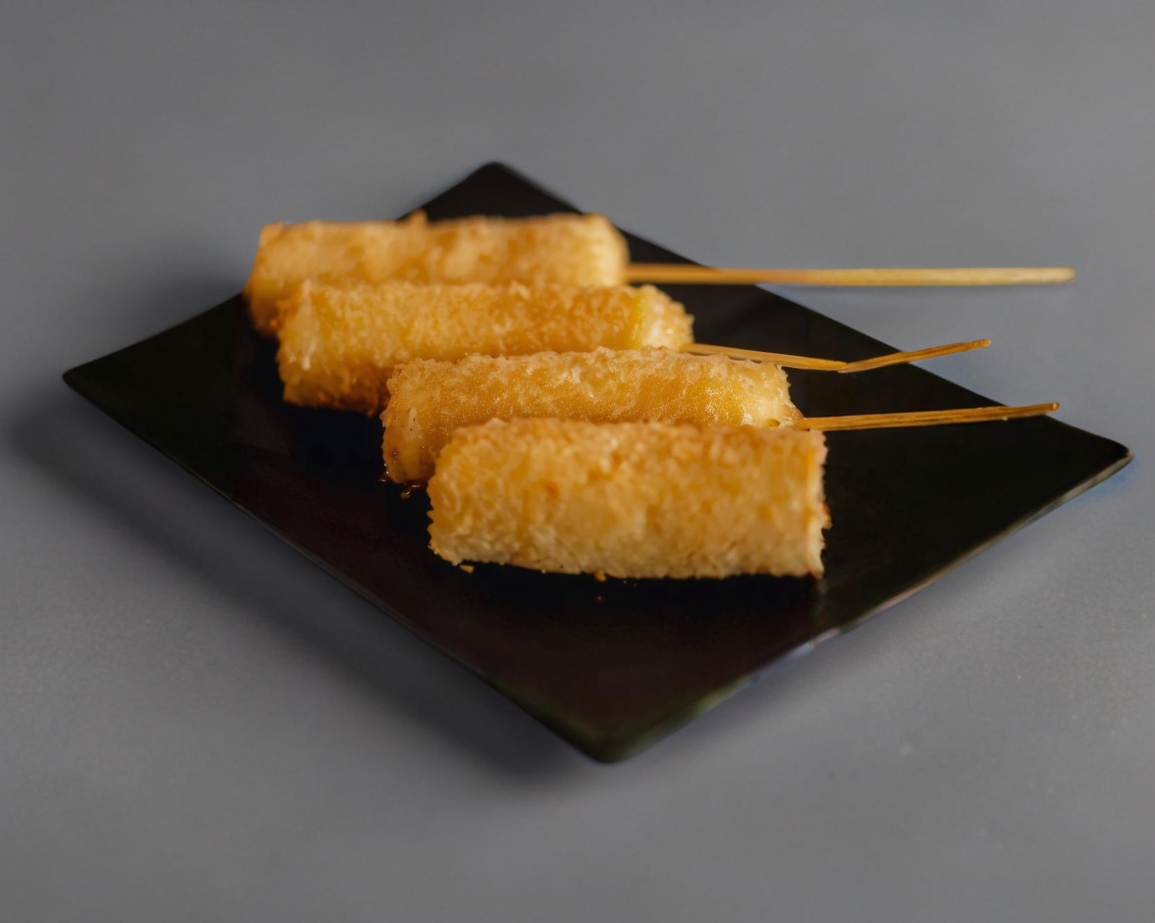 4 Piezas de kushiages de plátano con queso philadelphia.