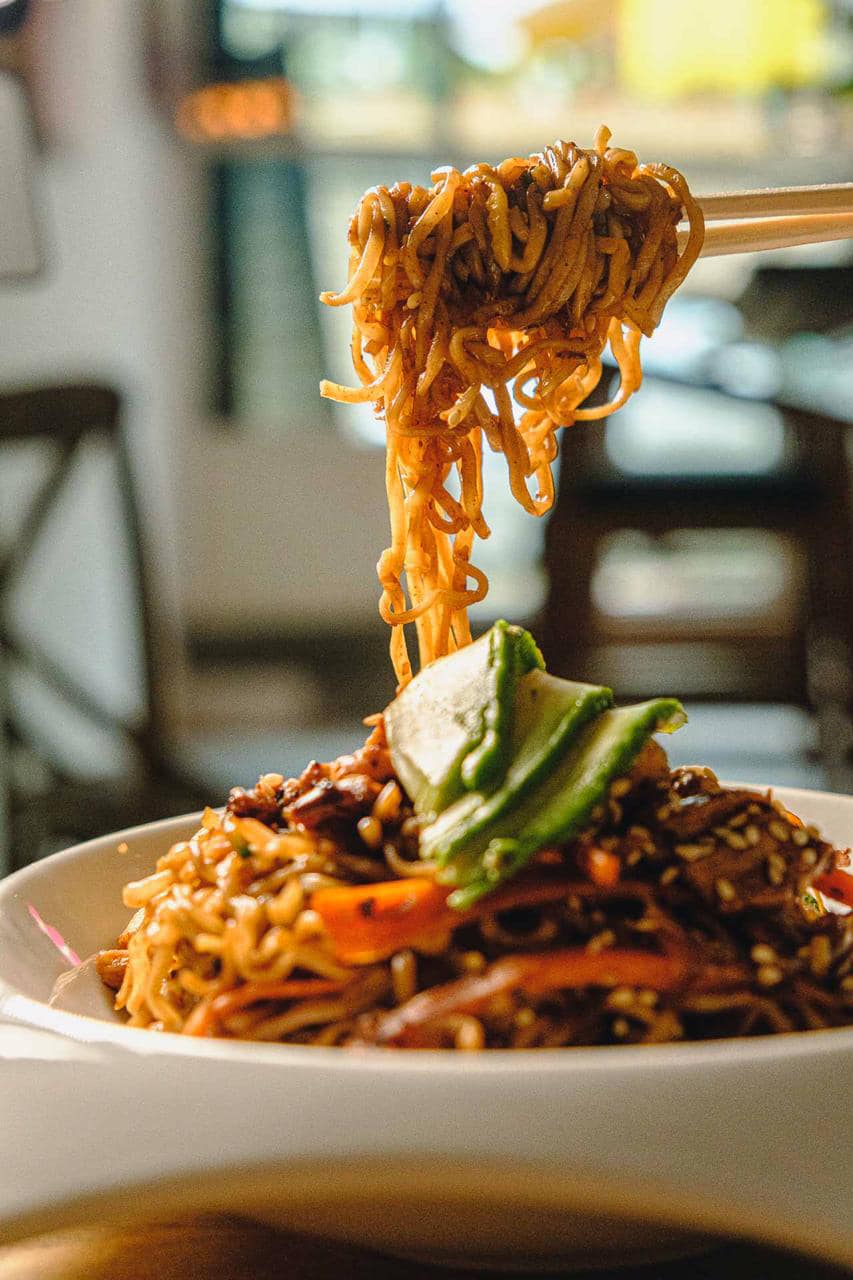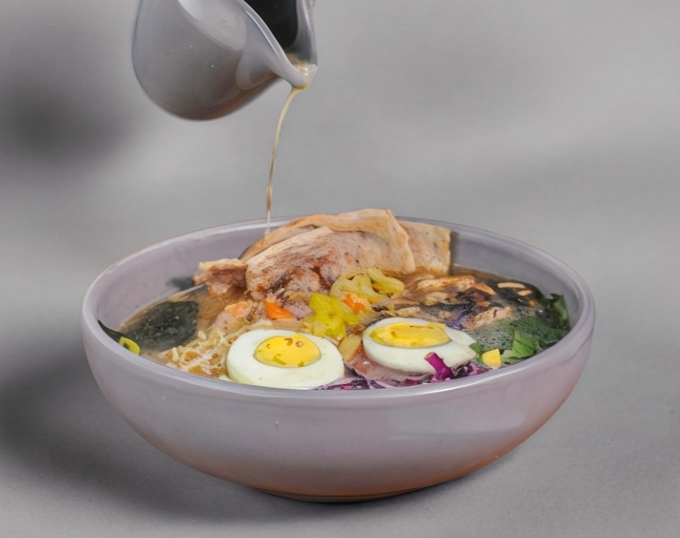 Fondo de res, espinaca, alga nori, col morada, setas o champiñones y huevo pochado.