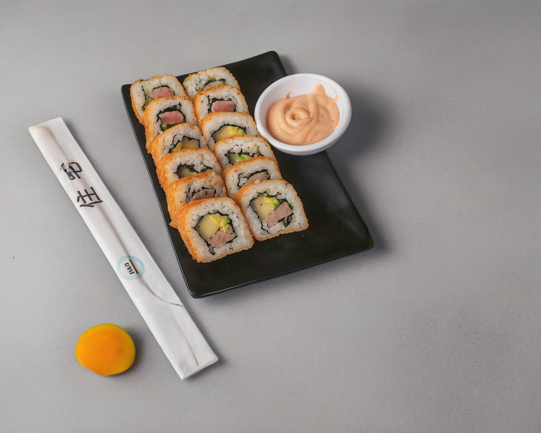 Por dentro: queso manchego, salmón, aguacate y aderezo chipotle. Cubierta: empanizado y bañado con salsa de anguila.