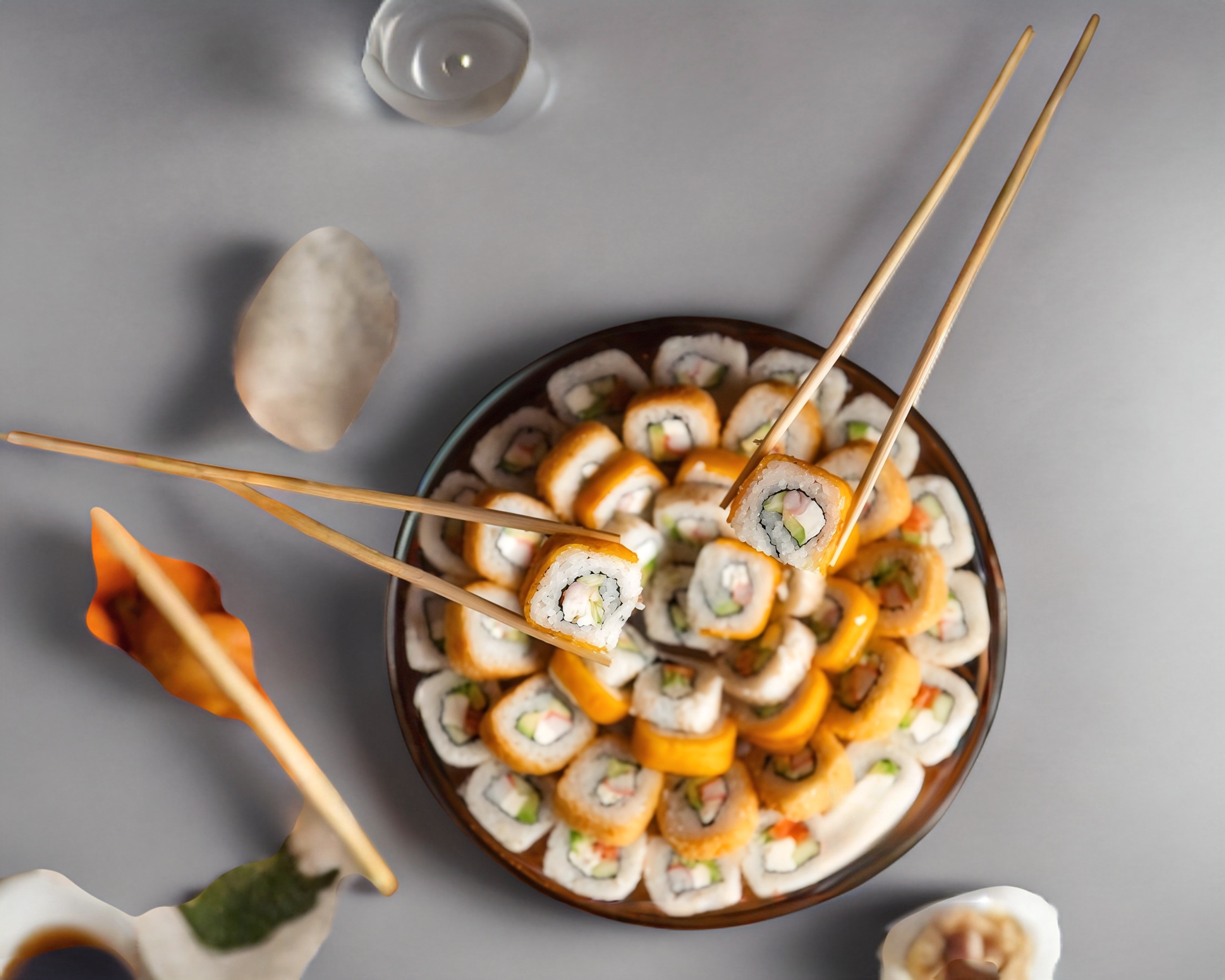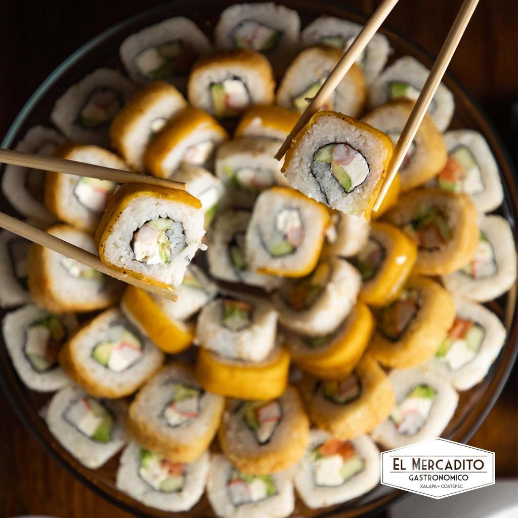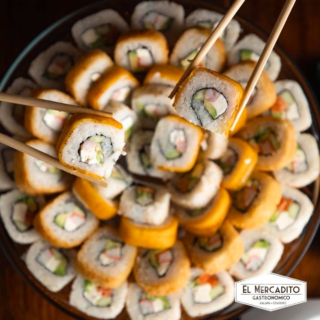 50 rollitos de sushi variado (camarón, salmón y surimi con queso philadelphia, aguacate y pepino, cubiertos de ajonjolí, plátano y empanizado) Incluye soya, chiles toreados o aderezo de chipotle.