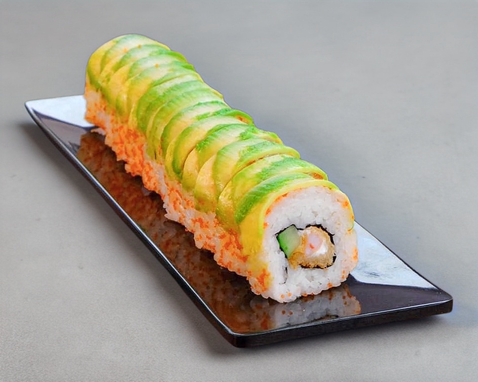 Dentro: cangrejo empanizado, relleno de queso philadelphia y massago. Por fuera: aguacate.