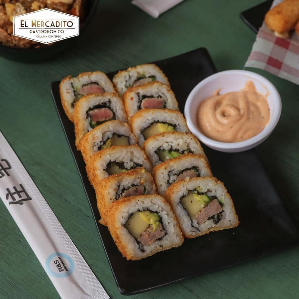 100 Rollitos de sushi variado (camarón, salmón y surimi con queso philadelphia, aguacate y pepino, cubiertos de ajonjolí, plátano y empanizado) 4 yakimeshi con pollo, 2 ordenes Kusiages plátano con queso philadelphia. Incluye soya, chiles toreados o aderezo de chipotle.