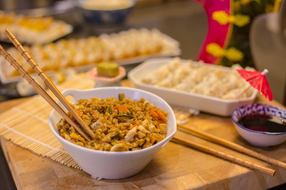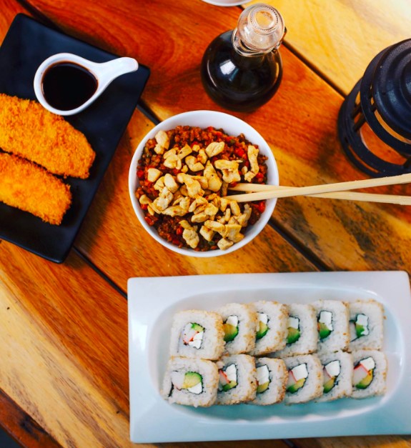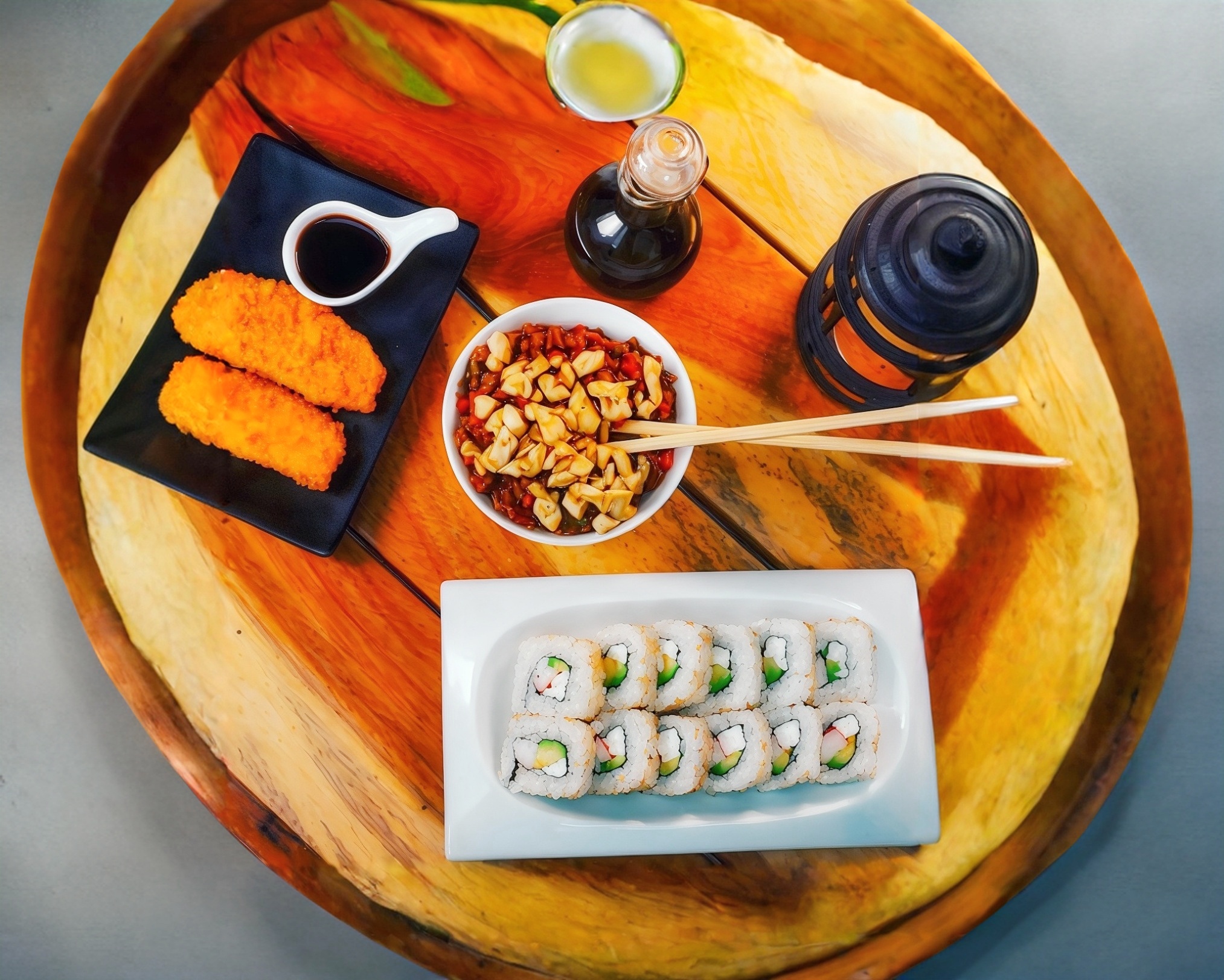 130 Rollitos variados. Relleno: Camarón, salmón y surimi, queso philadelphia, aguacate y pepino. Cubiertas: Ajonjolí, plátano y empanizados. 6 Yakimeshis de pollo (arroz frito). 4 Ordenes de kushiages plátano con queso philadelphia.