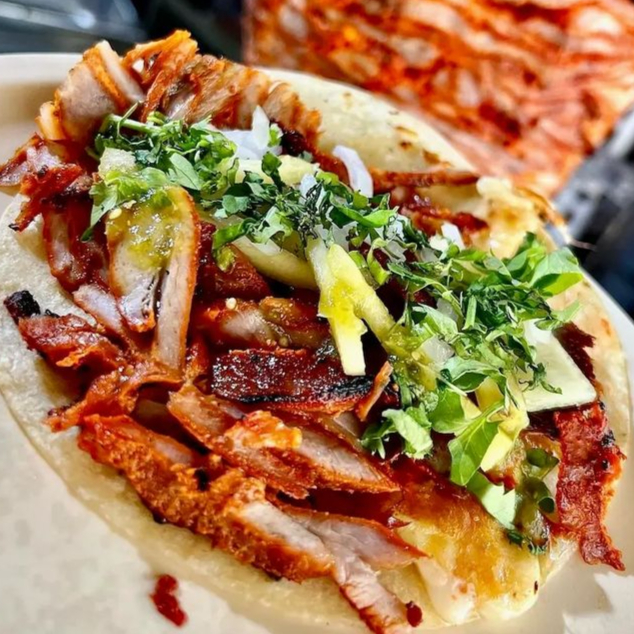 carne pastor envuelta en tortilla gigante de harina, lechuga, tomate, queso y frijol. Acompañado de limones y salsas