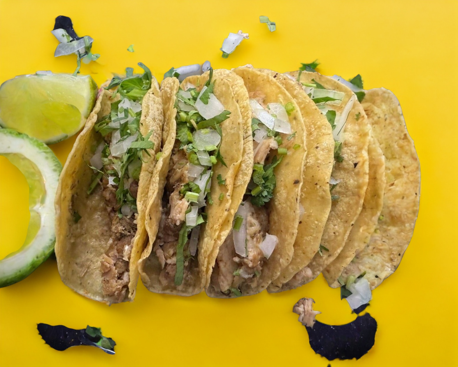 5 Tacos de cueritos (140g) con tortilla de maíz, con cebolla, cilantro, limones, opcional salsa verde, roja, habanero, chile de árbol.