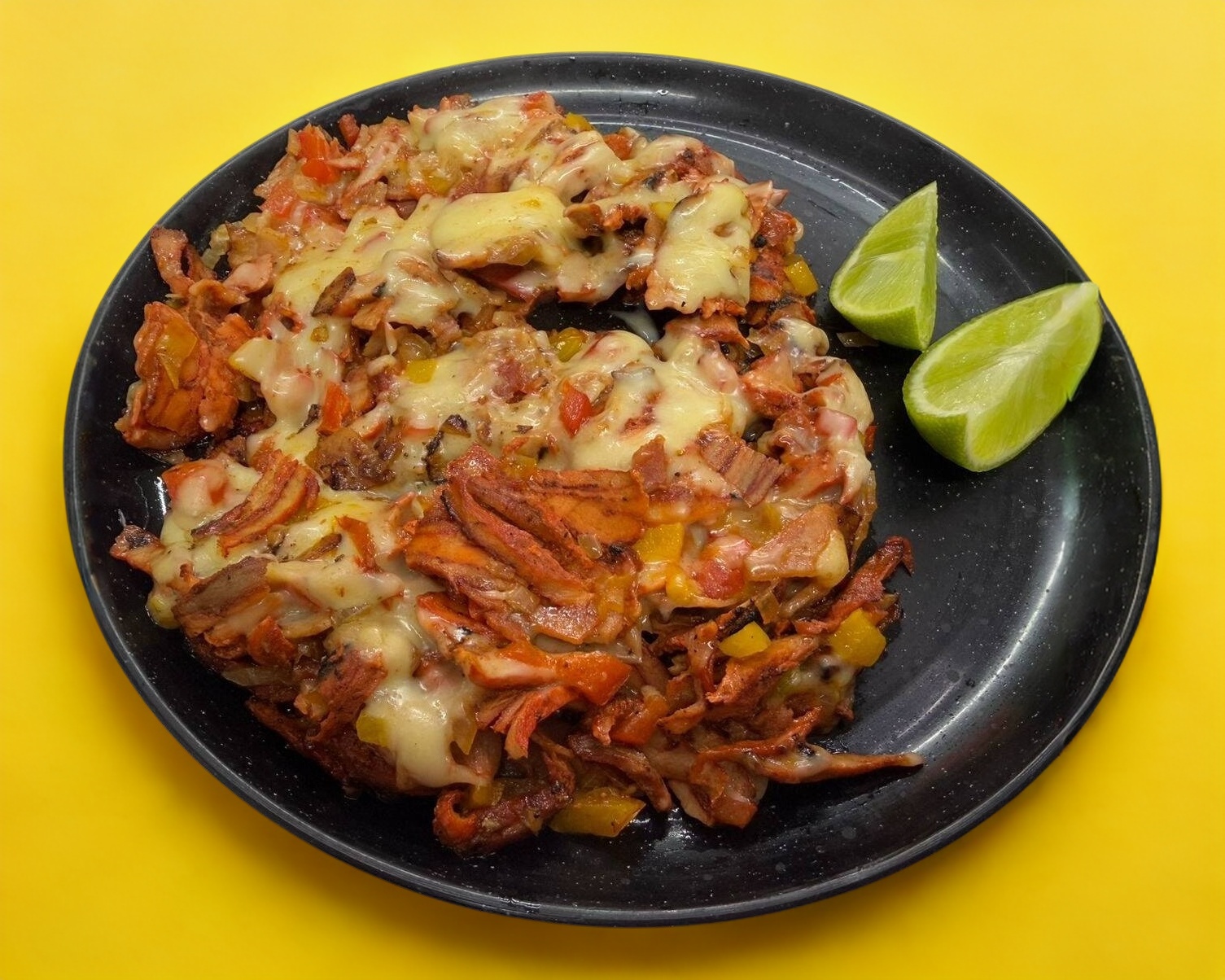 Maciza (250g) con tortilla de maíz, limones, preparado con tocino, jamón, cebolla y pimiento así como puede ser acompañado de salsa verde, roja, habanero o chile de árbol.