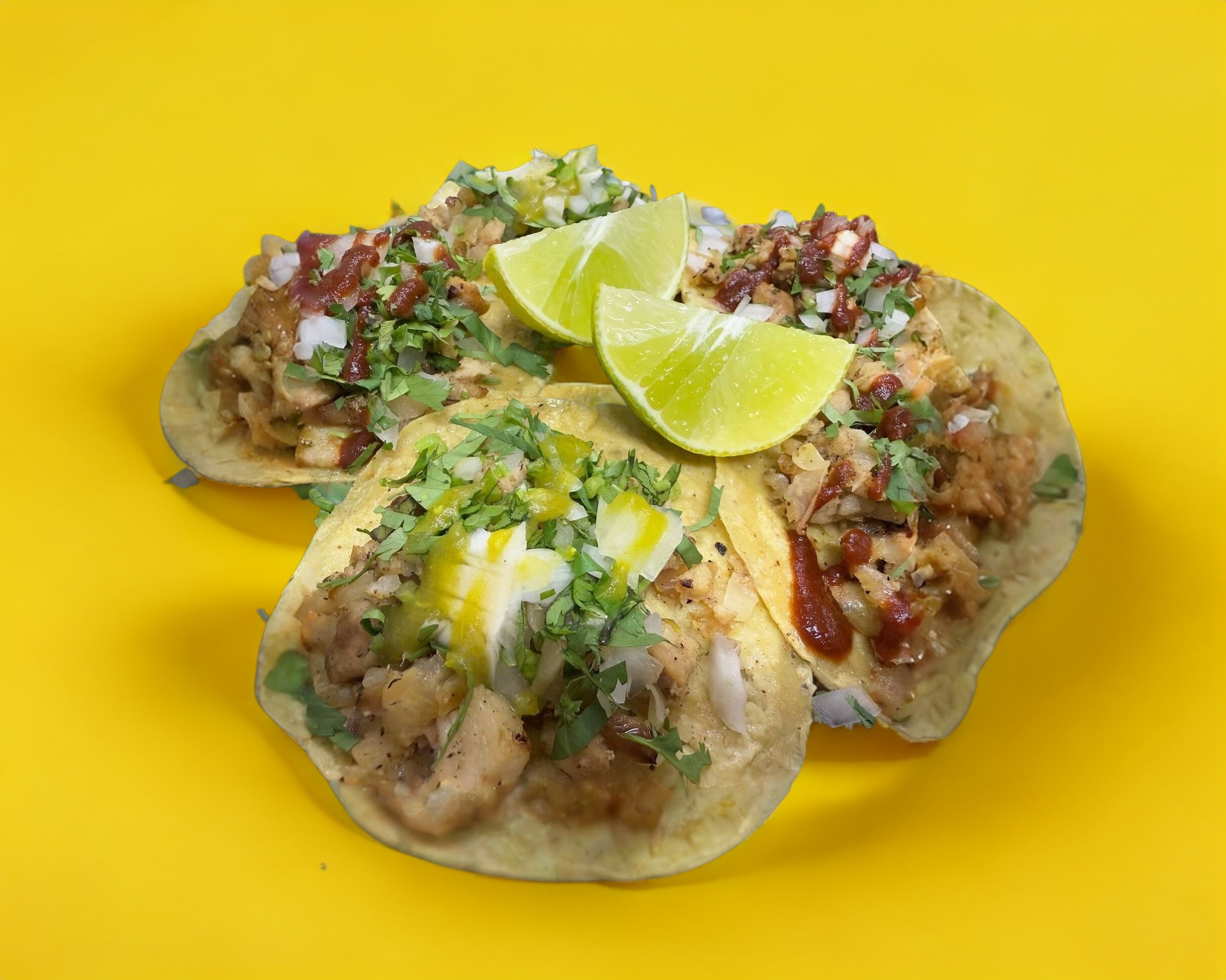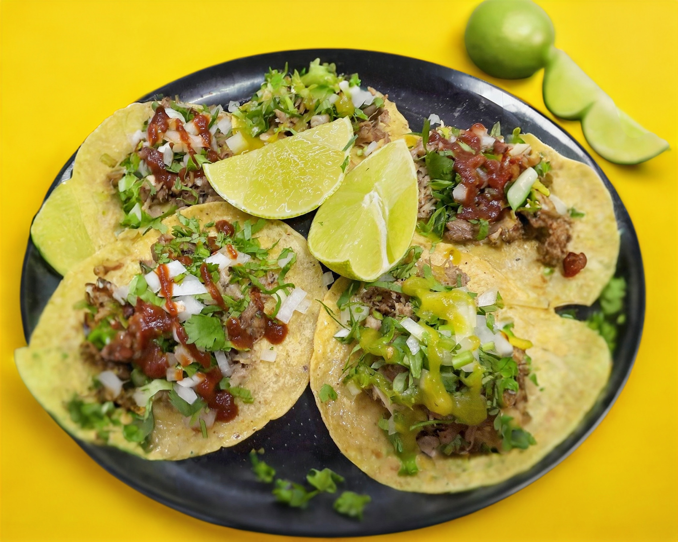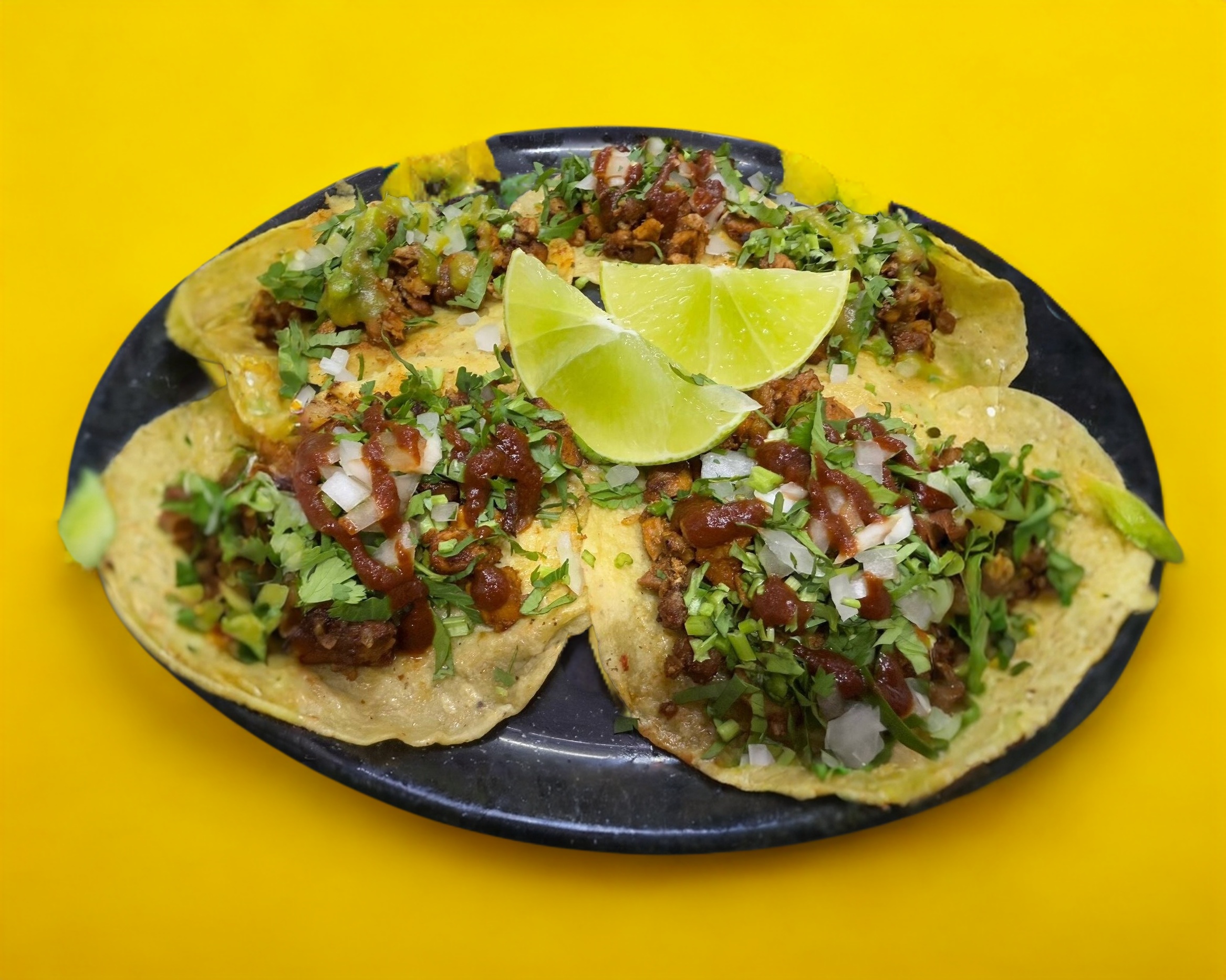 5 Tacos de maciza (140g) con tortilla de maíz, con cebolla, cilantro, limones, opcional salsa verde, roja, habanero, chile de árbol.