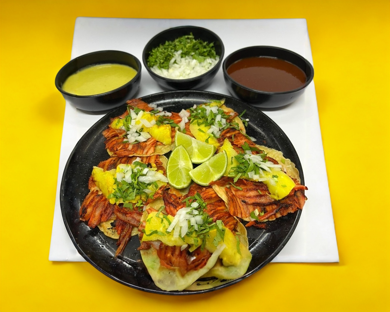 5 tacos de pastor con piña (150 g) con tortilla de maiz, con cebolla, cilantro, limones, opcional salsa verde, salsa habanero, salsa roja y salsa chile de arbol. (Platillo personal)