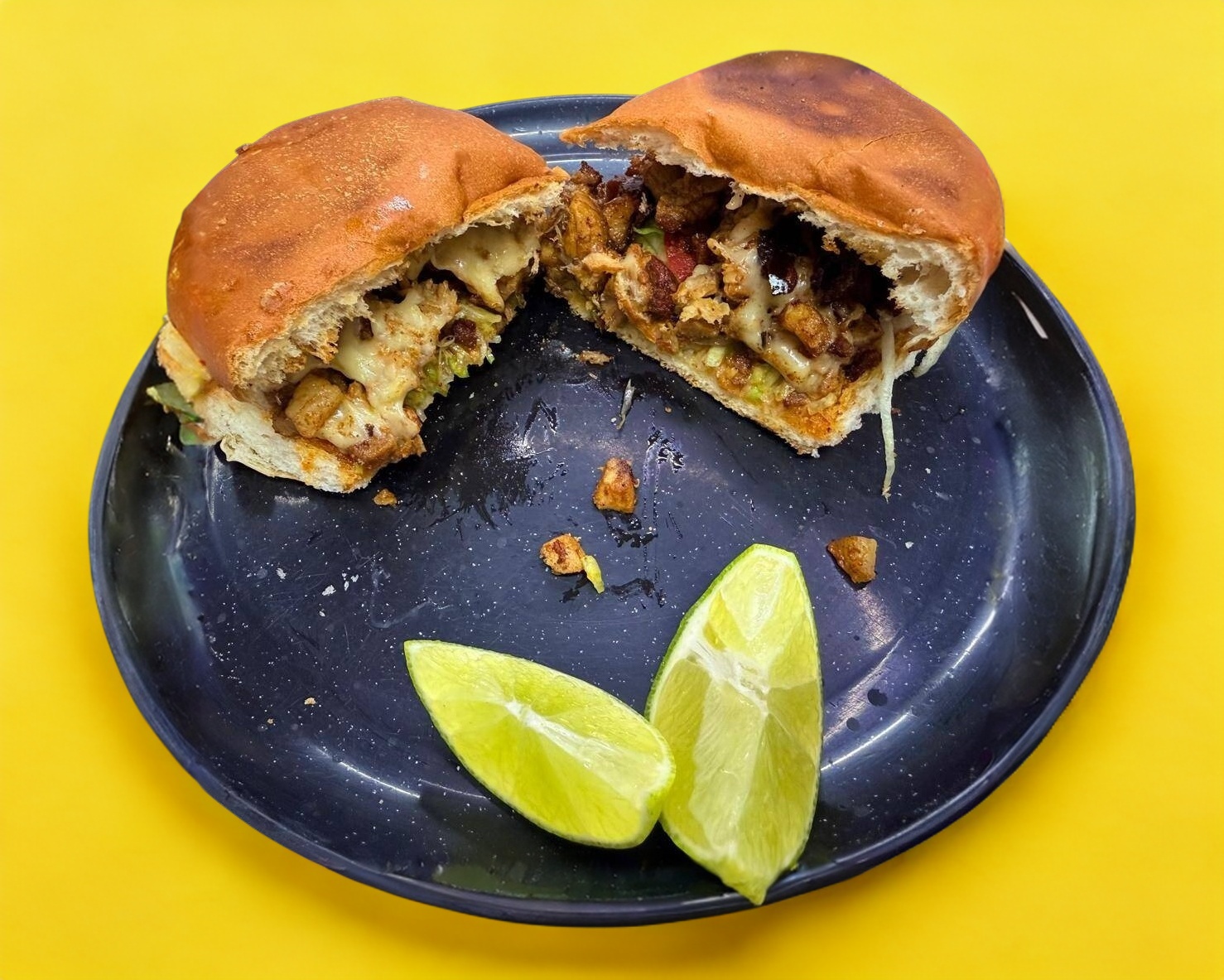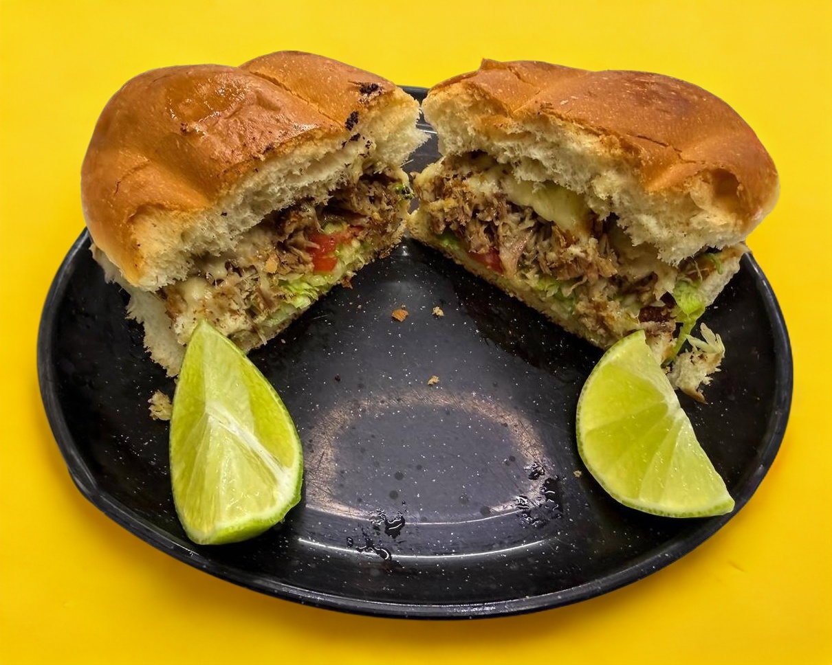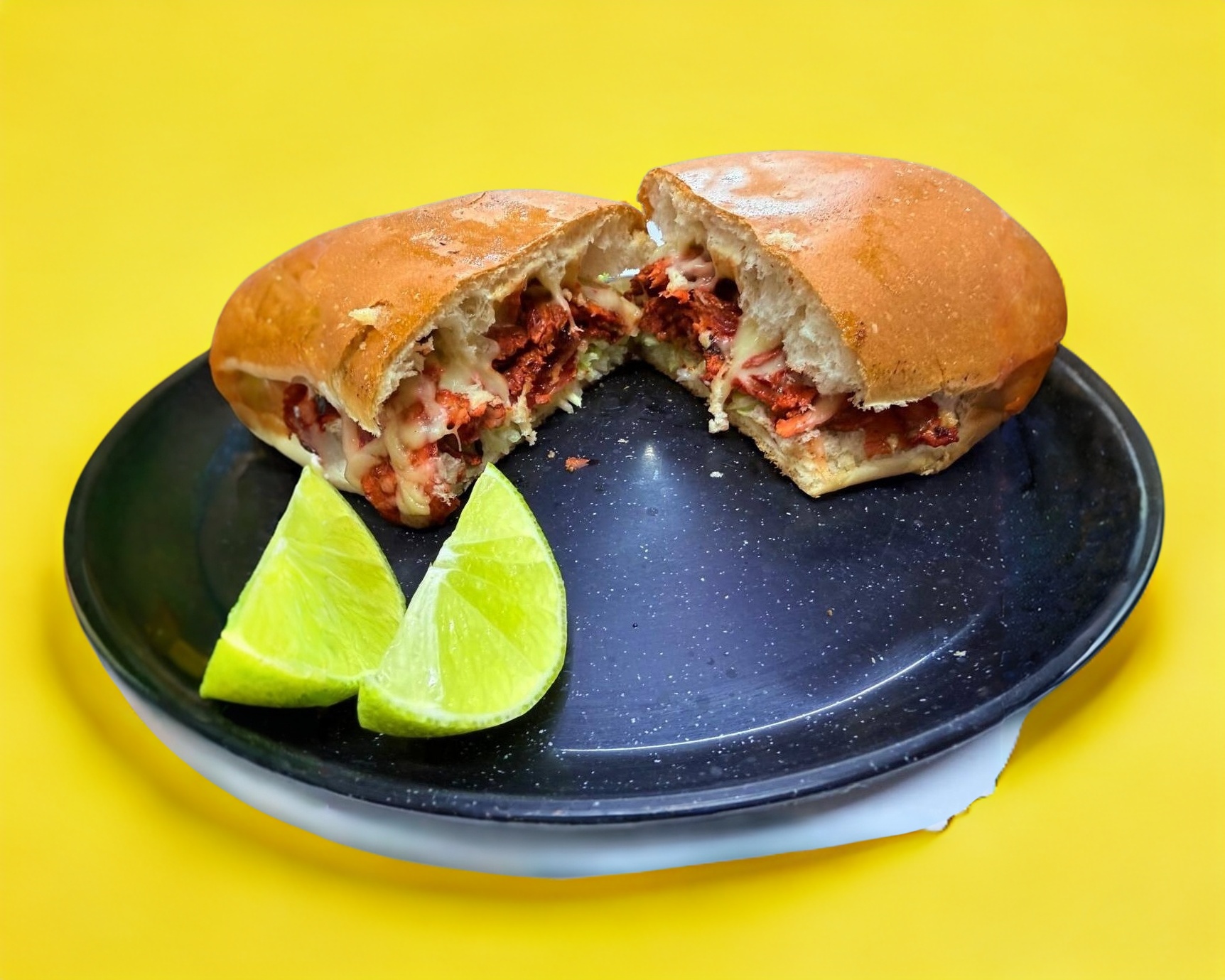 Torta de pastor a la plancha preparada con queso manchego, cebolla, lechuga, limones, tomate, mayonesa que puede ser acompañada de salsa verde, roja, habanero, chile de árbol o ensalada de col. (Porción personal)