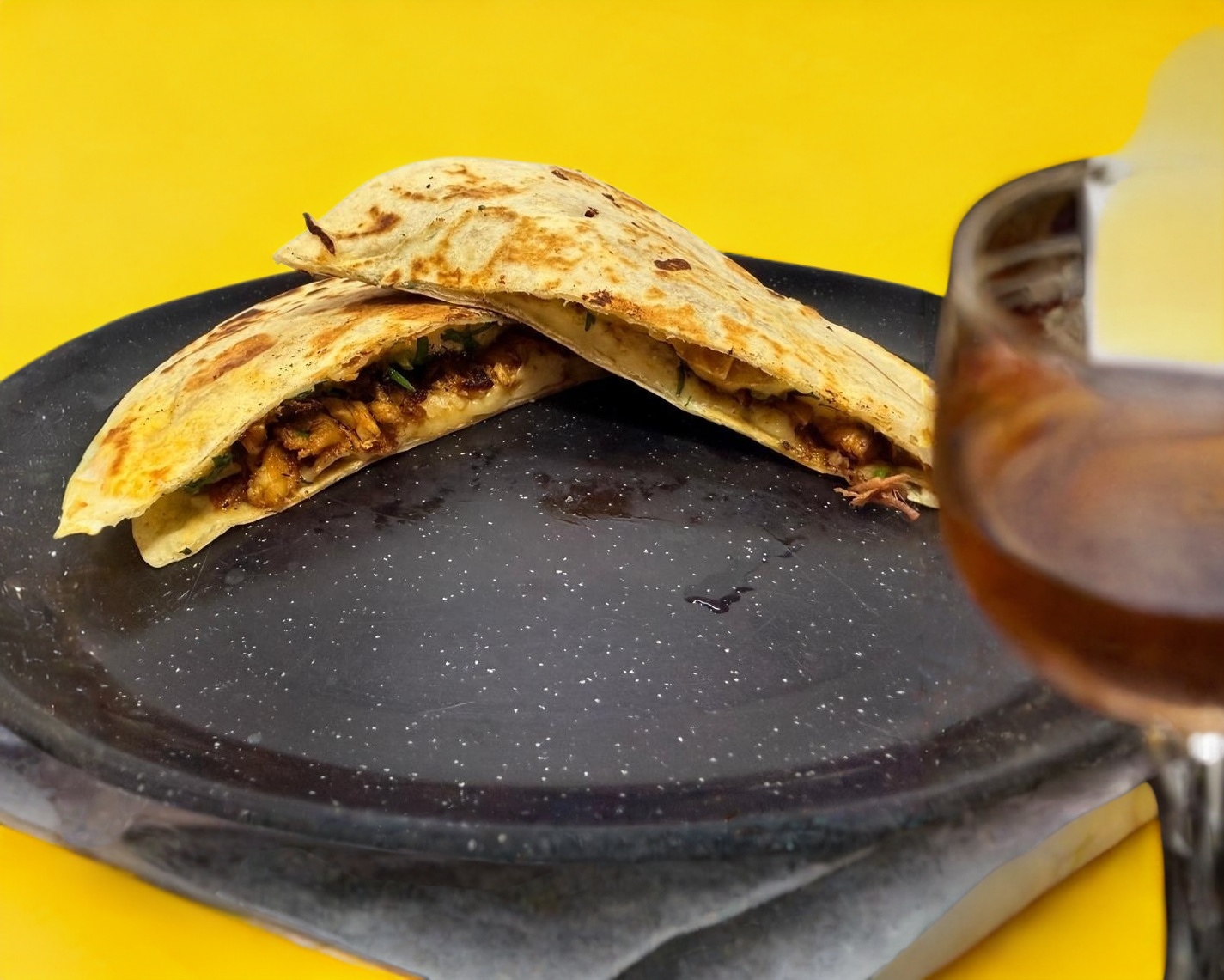 Gringa de bistec enchilado con tortilla de harina, limones, preparada con queso manchego, cilantro y cebolla que puede ser acompañado de salsa verde, roja, habanero o chile de árbol.