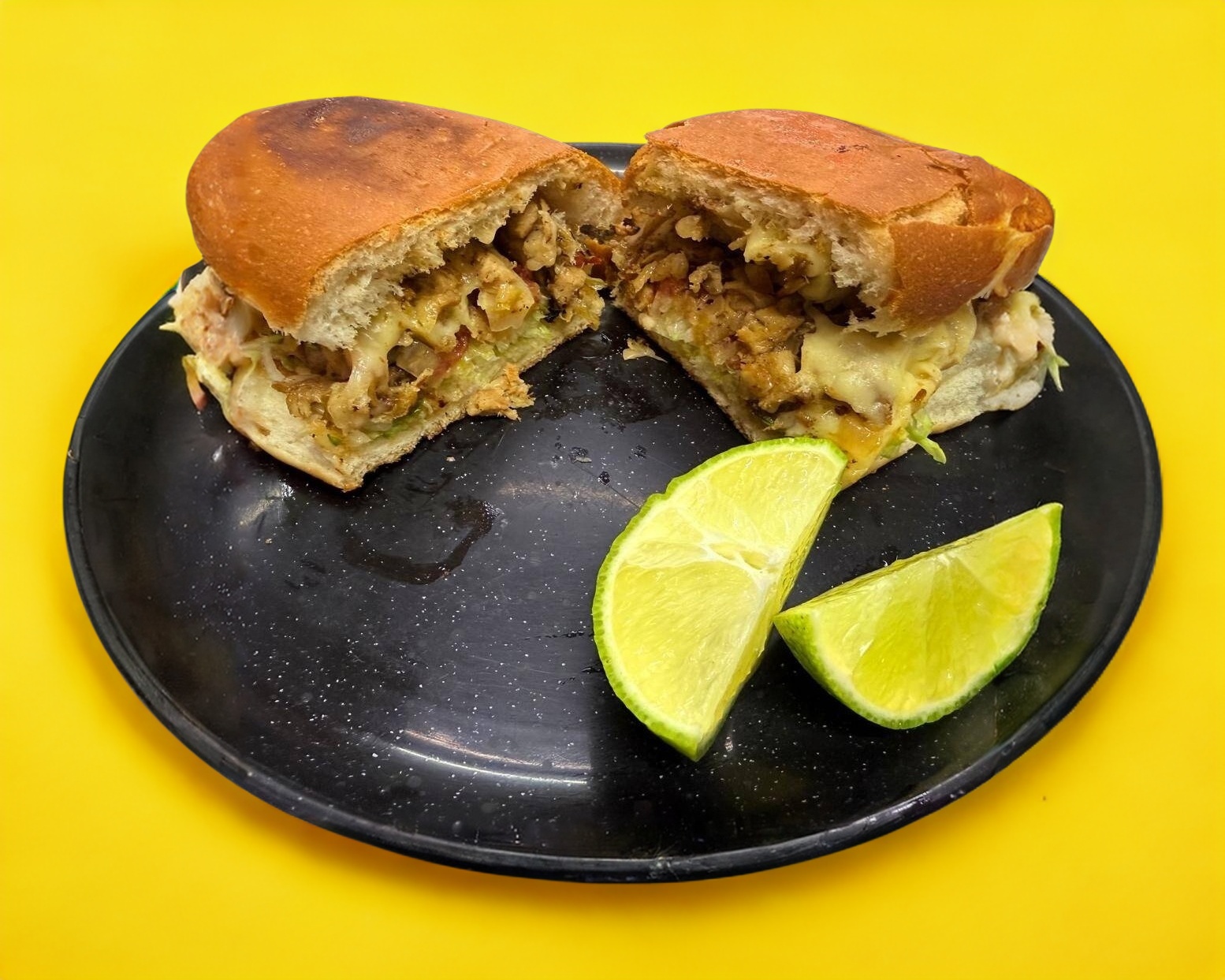Torta de bistec Enchilado a la plancha preparada con queso manchego, cebolla, lechuga, limones, tomate, mayonesa que puede ser acompañada de salsa verde, roja, habanero, chile de árbol o ensalada de col.