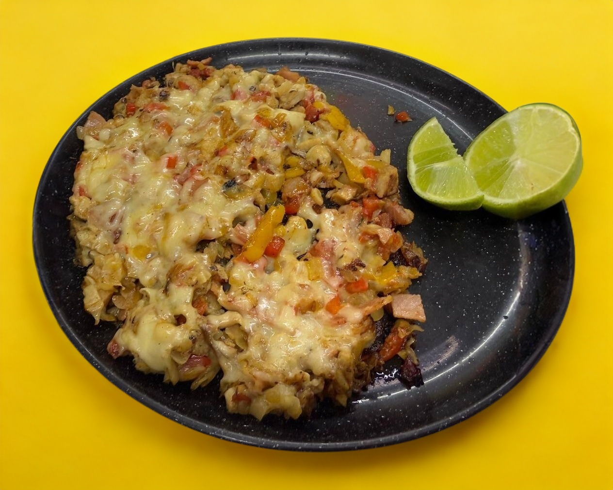 Bistec enchilado (250g) con tortilla de maíz, limones, preparado con tocino, jamón, cebolla y pimiento así como puede ser acompañado de salsa verde, roja, habanero o chile de árbol.