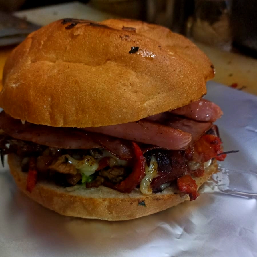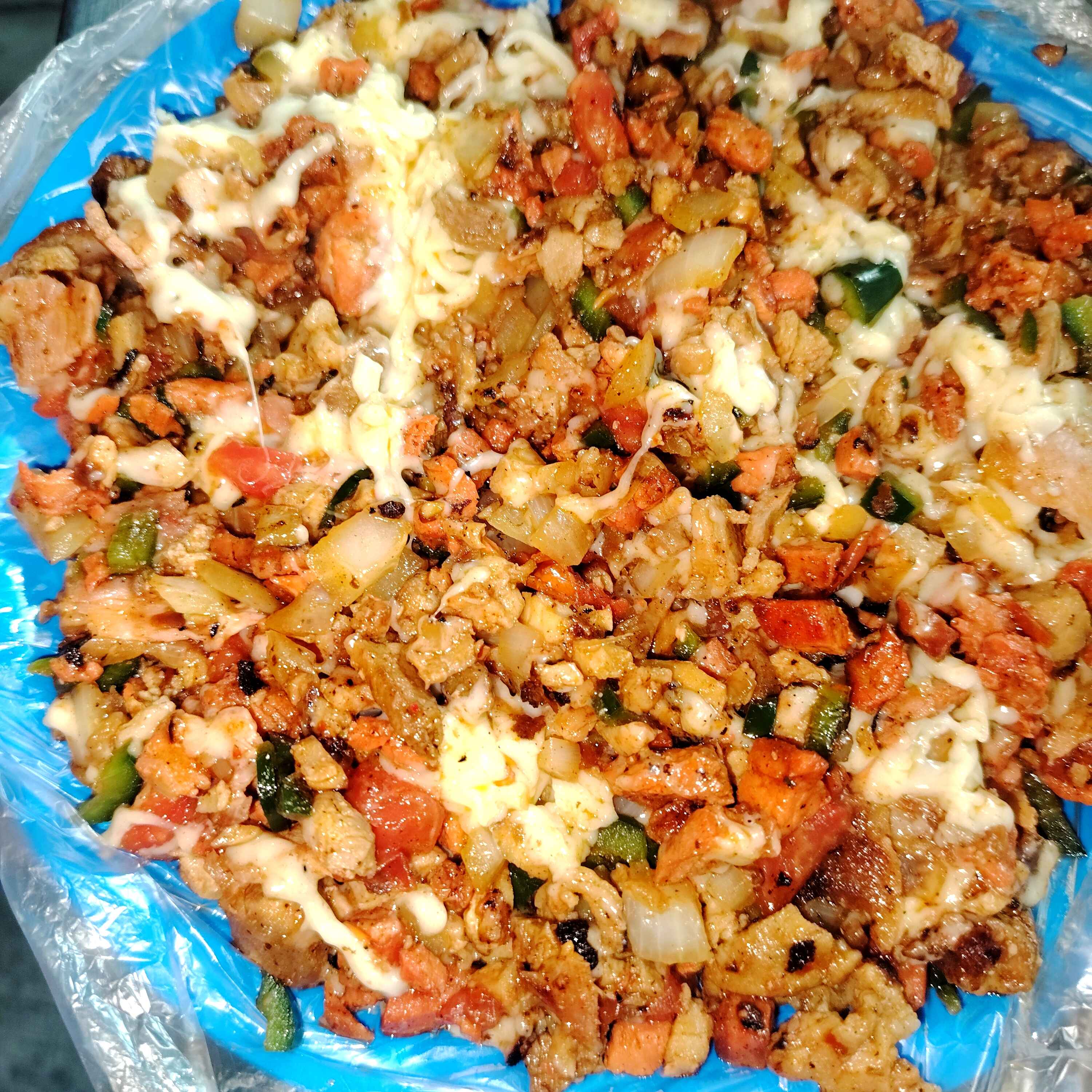 Carne de cerdo con cebolla chile tomate queso tocino salchicha i una costra d queso manchego