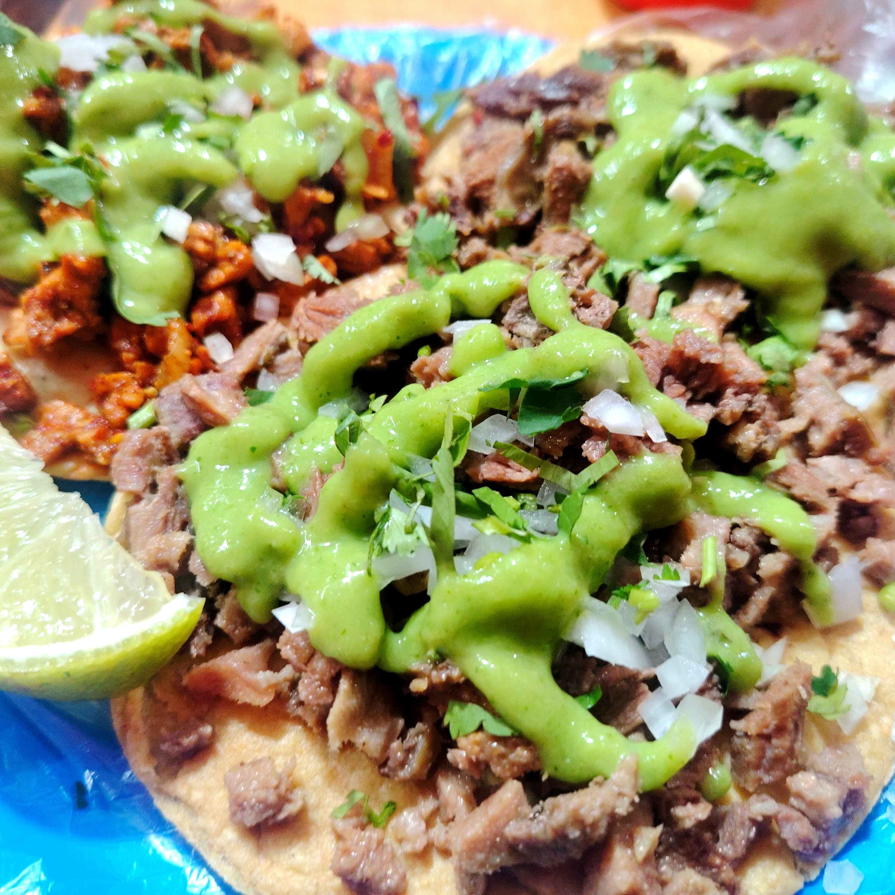 Tacos echos con cabeza de cerdo bien picadita rica tortilla a mano cebolla cilantro