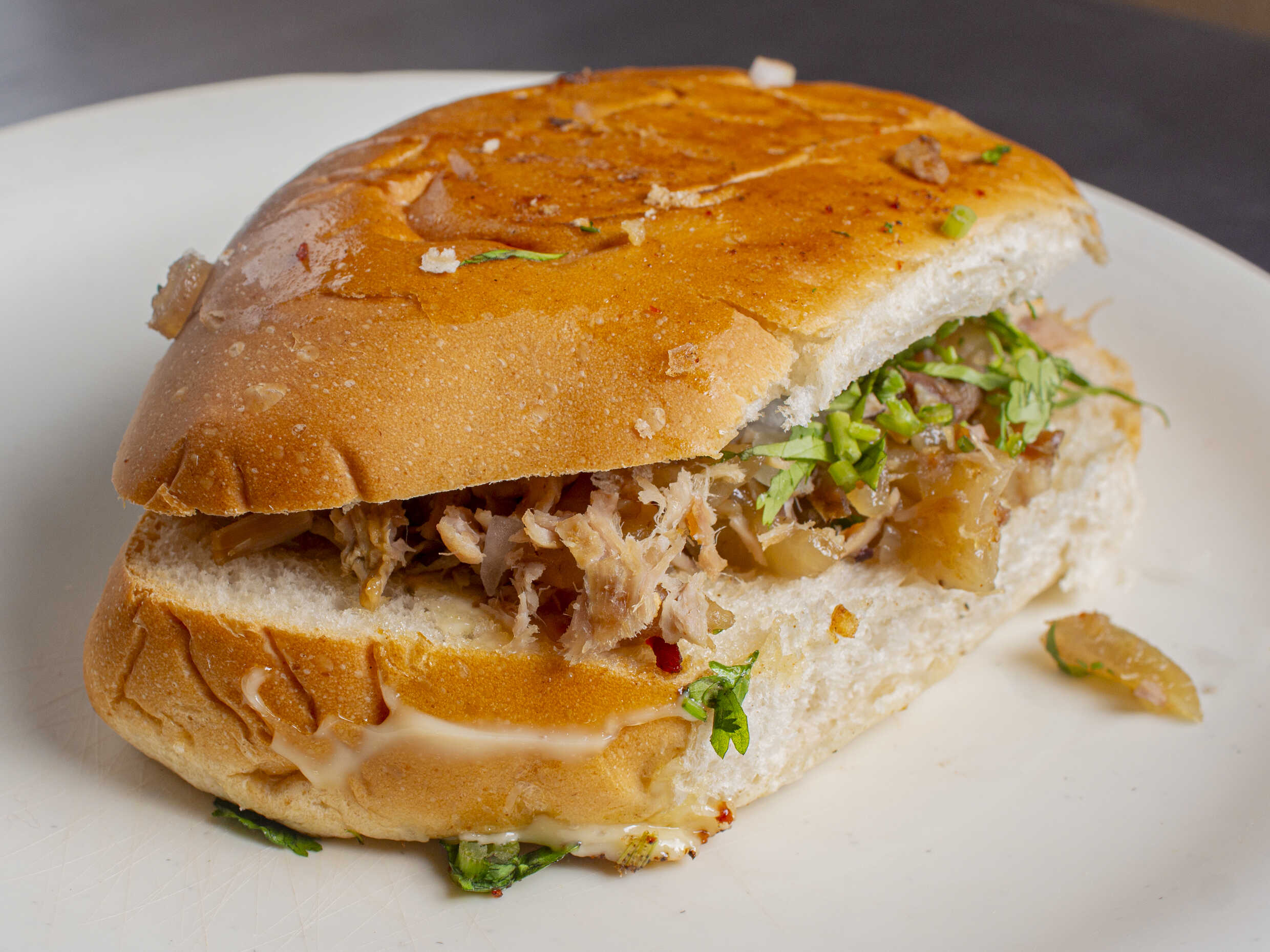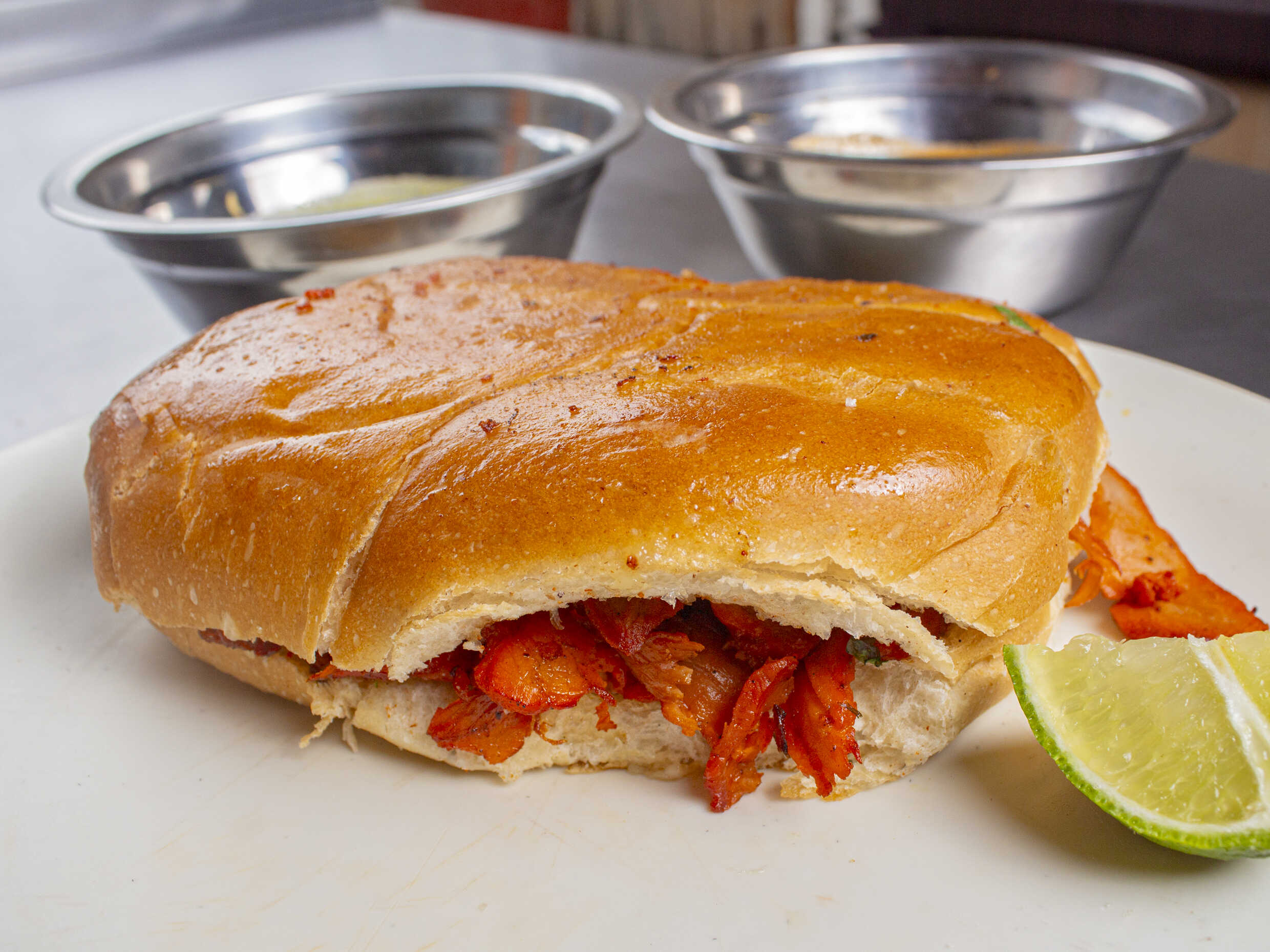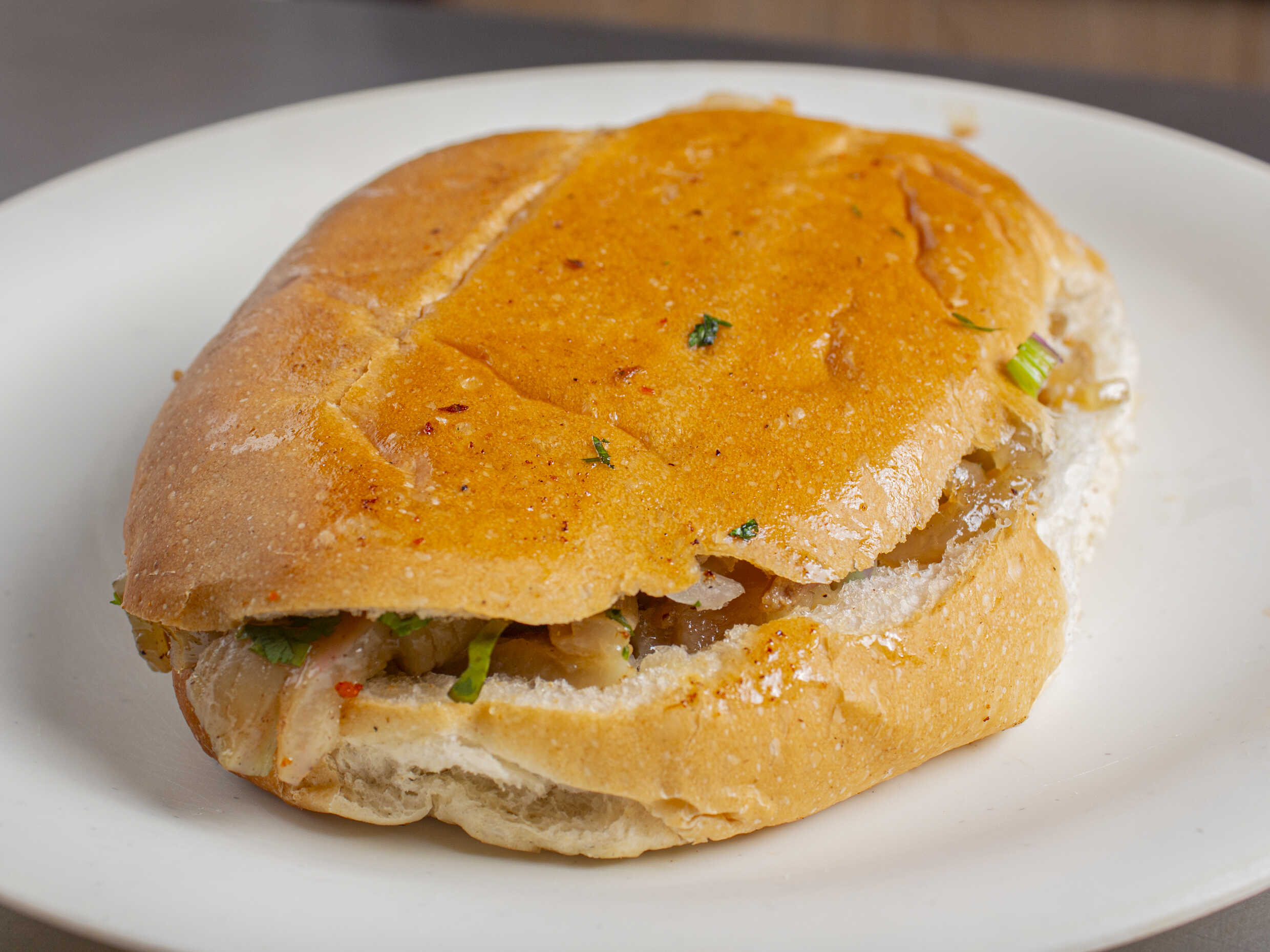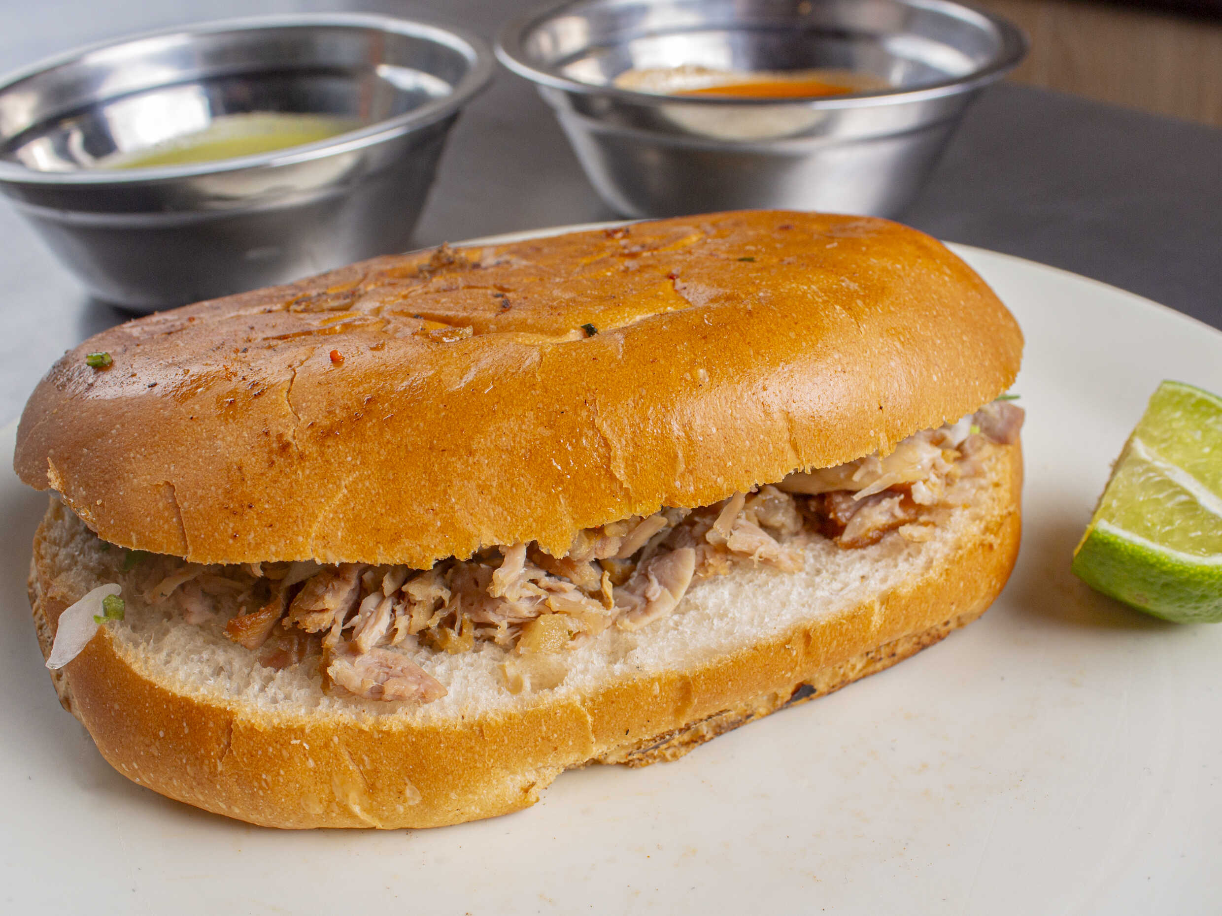 Pan bolillo con mayonesa, verdura (cebolla y cilantro), carne campechana, salsas de la casa y limones.