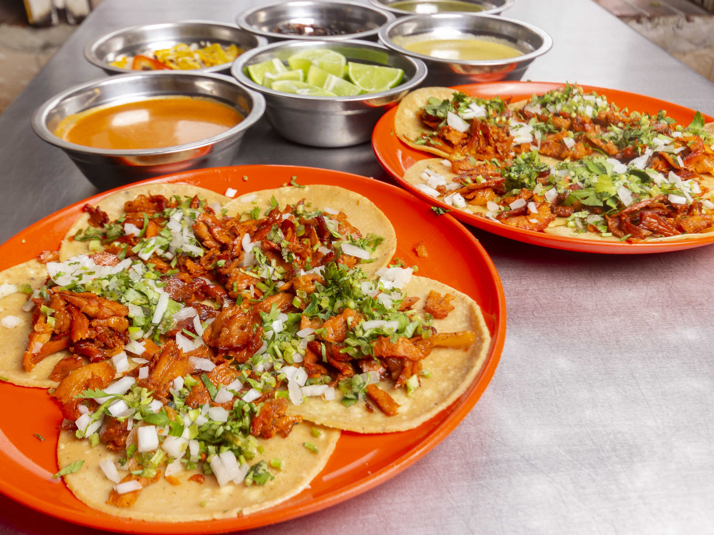 Tortilla hecha a mano con carne de pastor 500 gr, acompañadas de cebolla, cilantro, pepino, salsa verde, salsa roja y limones.