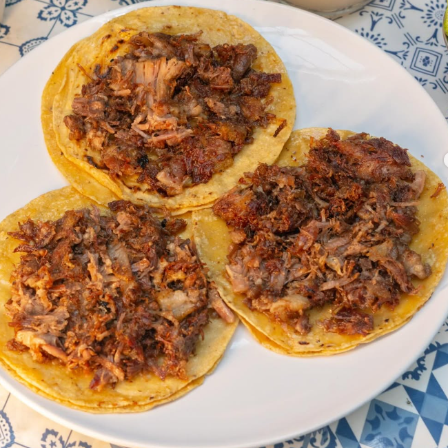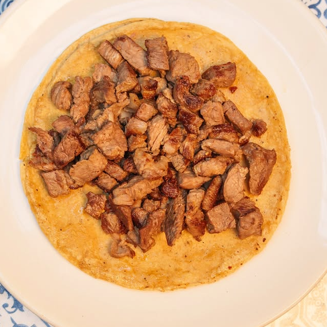 doble tortilla de maiz a mano y carne de maciza al vapor.
