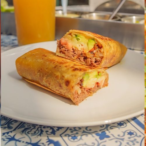 Burro de tortilla de harina estilo sonorense, frijoles, tomate, cebolla asada, aguacate y queso Monterrey con una medida aproximada de 25 cm (400 gramos).