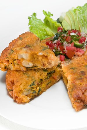Torta de camarón, acompañada con arroz y ensalada.