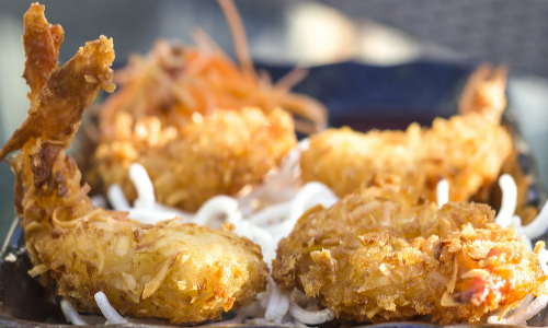 Camarones empanizados con coco rallado, acompañados de una ensalada de zanahoria y una salsa agridulce de guayaba.