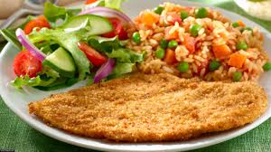 Filete de pescado empanizado acompañado de ensalada y arroz