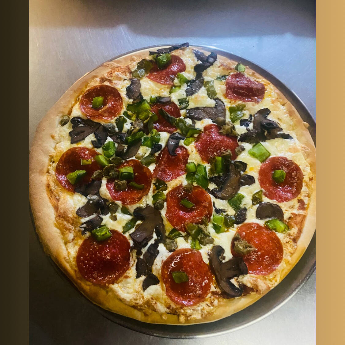 Peperoni, champiñones, pimiento verde, alcaparras y aceitunas negras