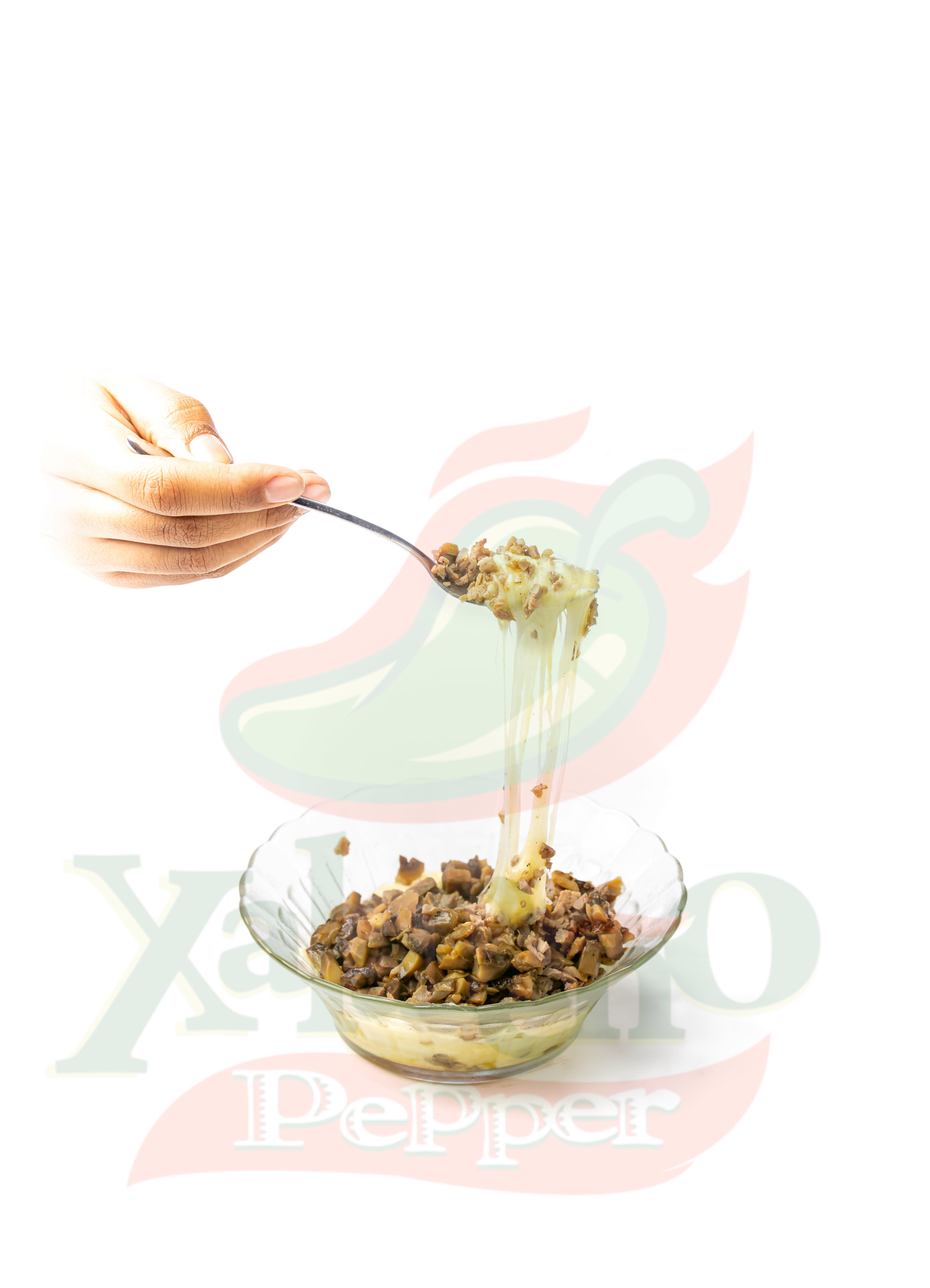 Papa asada con chmpiñón, queso amarillo y queso manchego