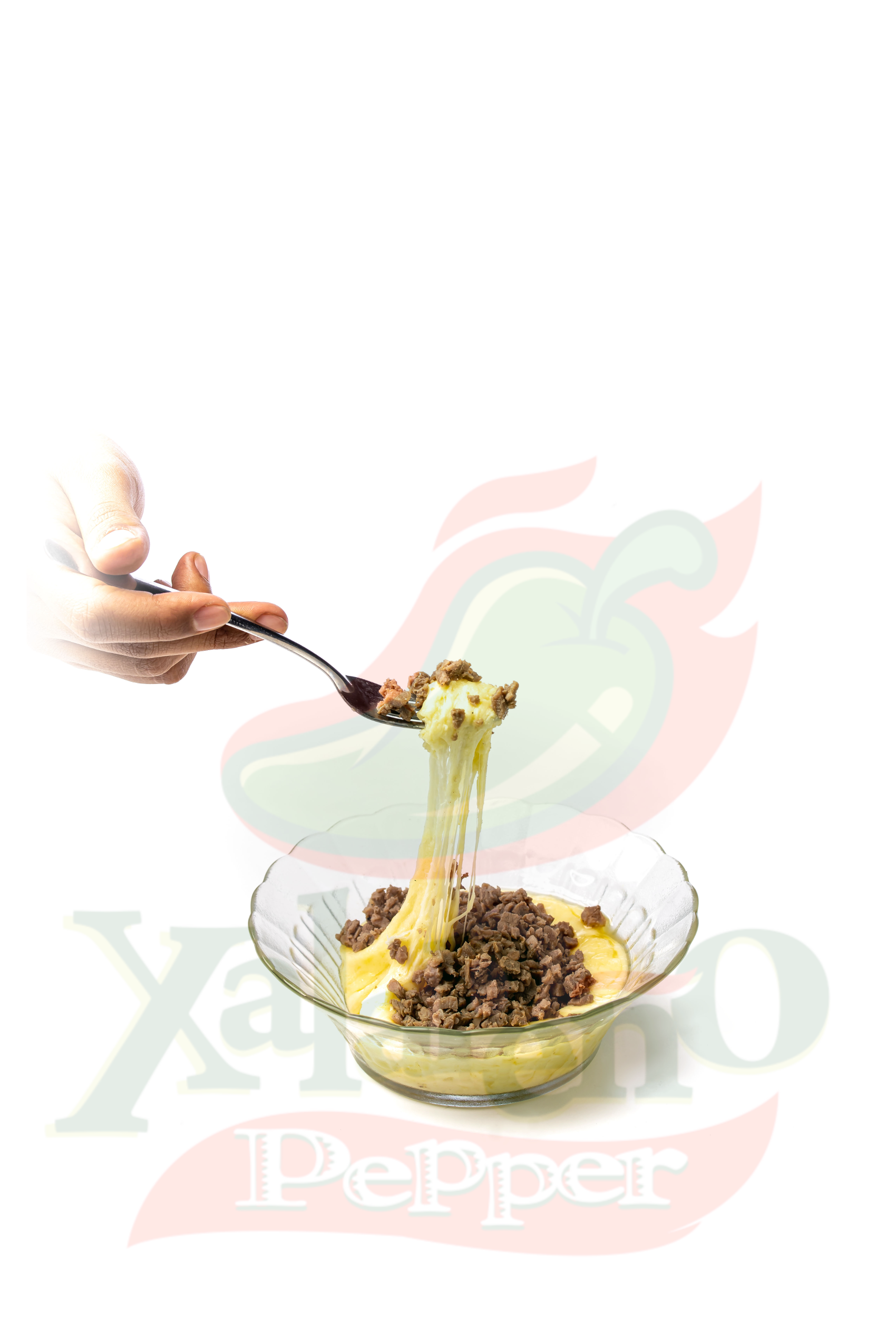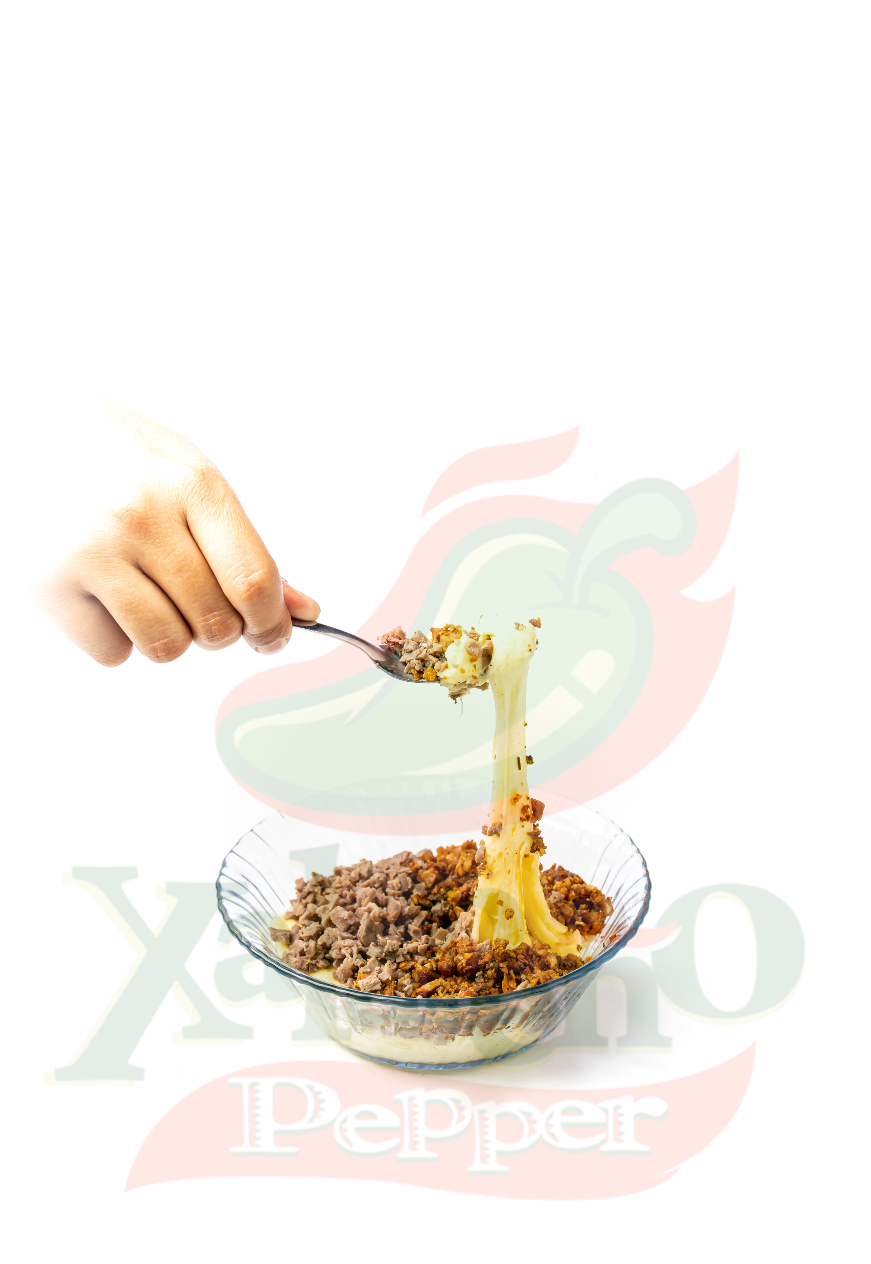 Papa asada con carne, queso amarillo, queso manchego y ahogada en frijoles charros.