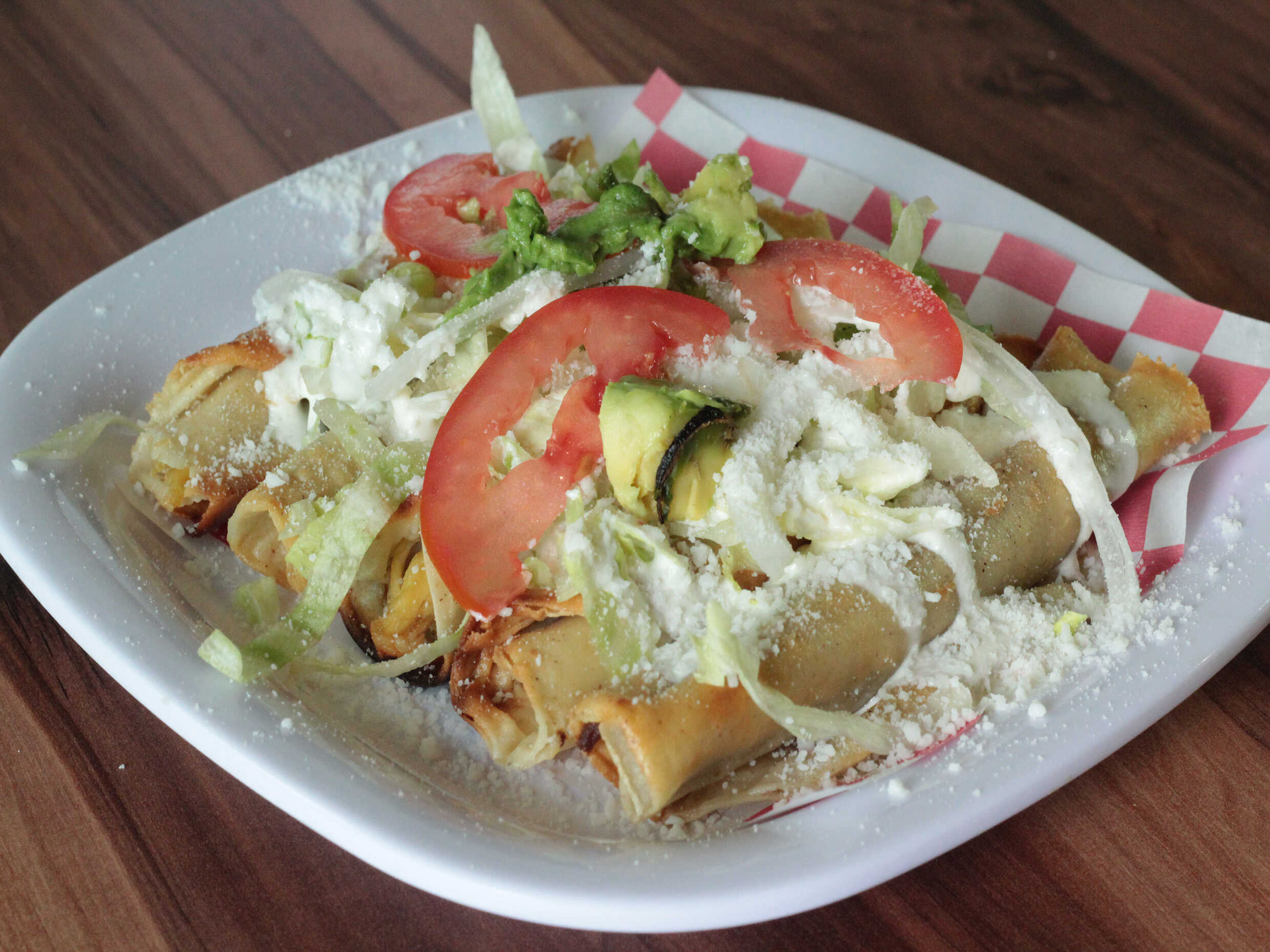 Orden de flautas, incluye verdura y salsas.