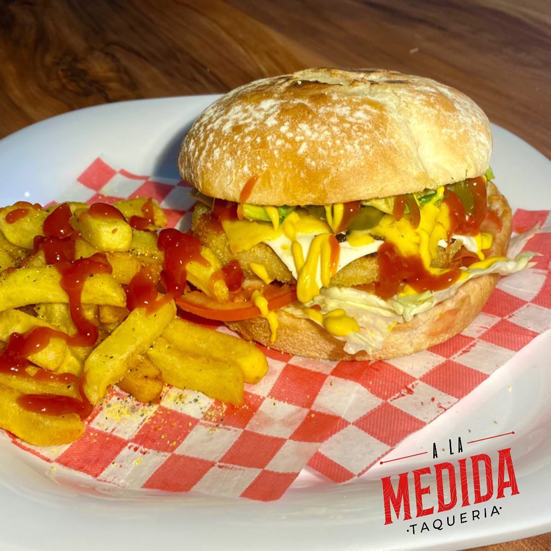Hamburguesa artesanal con verduras, cátsup, mayonesa, chiles y queso amarillo. Incluye 100 gr. papas a la francesa.