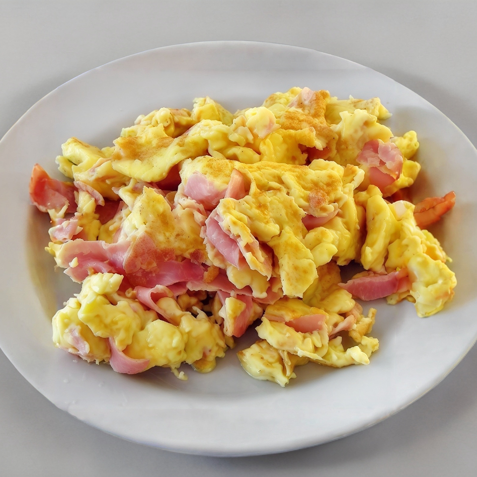 Huevos revueltos con jamón y tocino, servidos con crujientes totopos. (Todos los platillos se sirven acompañados de frijoles refritos, chilaquiles rojos o verdes y pan de caja crujiente).