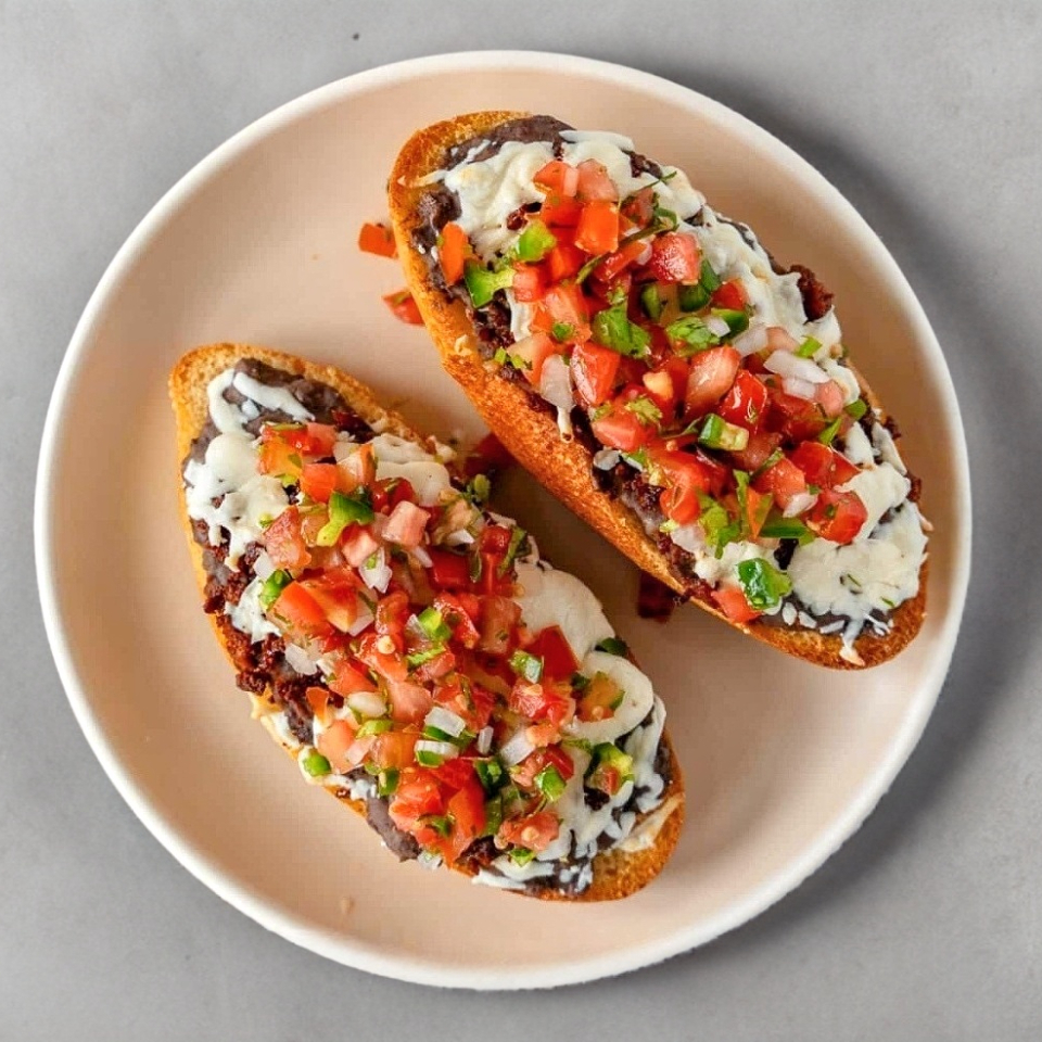 Pan bolillo tostado untado con frijoles refritos y cubierto con queso gratinado, servido con pico de gallo fresco. Un clásico mexicano lleno de sabor.