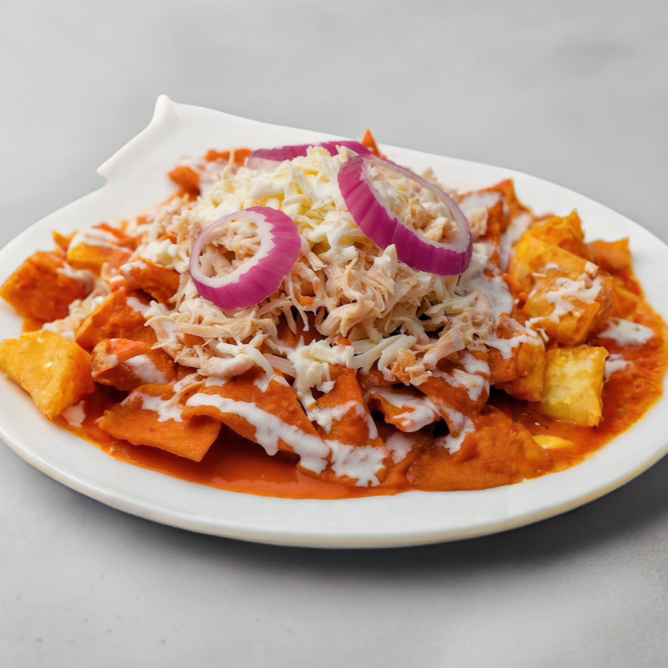 Chilaquiles con salsa de habanero toreados y pollo tierno, coronados con crema, queso fresco y cebolla morada. Un platillo picante y lleno de sabor para los que buscan intensidad.