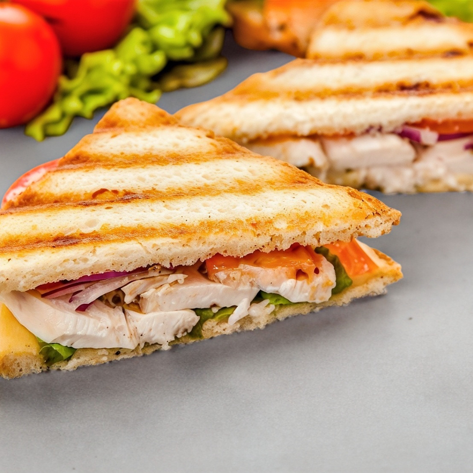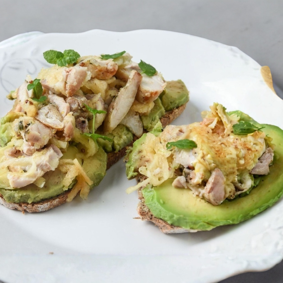 Pan artesanal tostado, cubierto con jugoso pollo a la parrilla, acompañado de aguacate y vegetales frescos. Una opción saludable y deliciosa para cualquier momento.