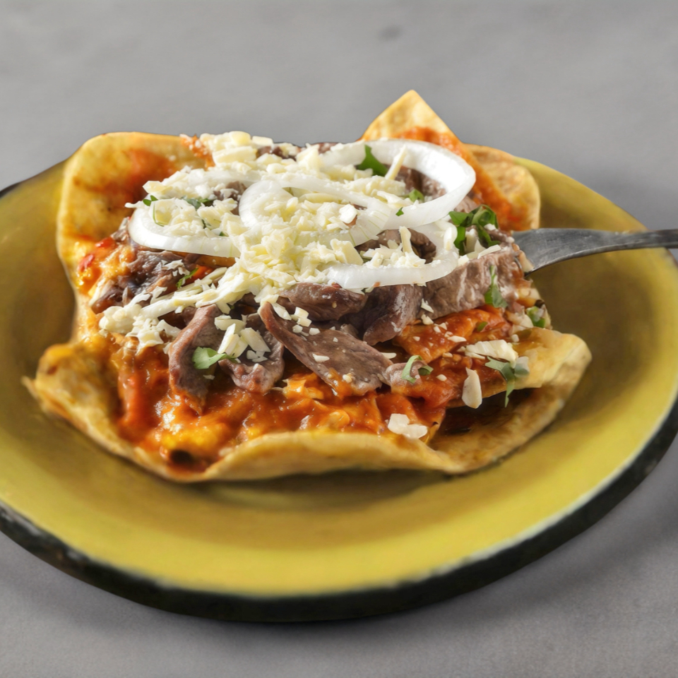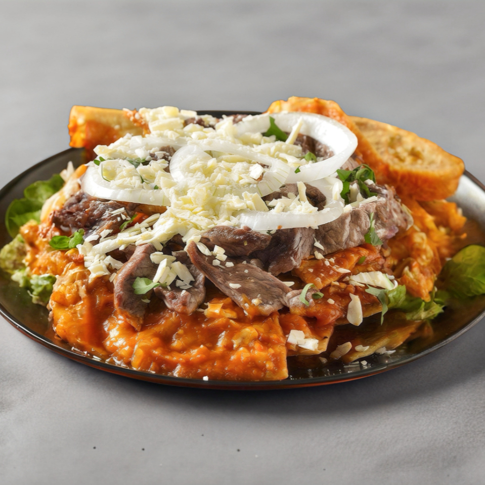 Chilaquiles bañados en deliciosa salsa poblana, acompañados de jugosa arrachera a la parrilla como proteína, coronados con crema, queso fresco y cebolla morada. Un platillo lleno de sabor y tradición.
