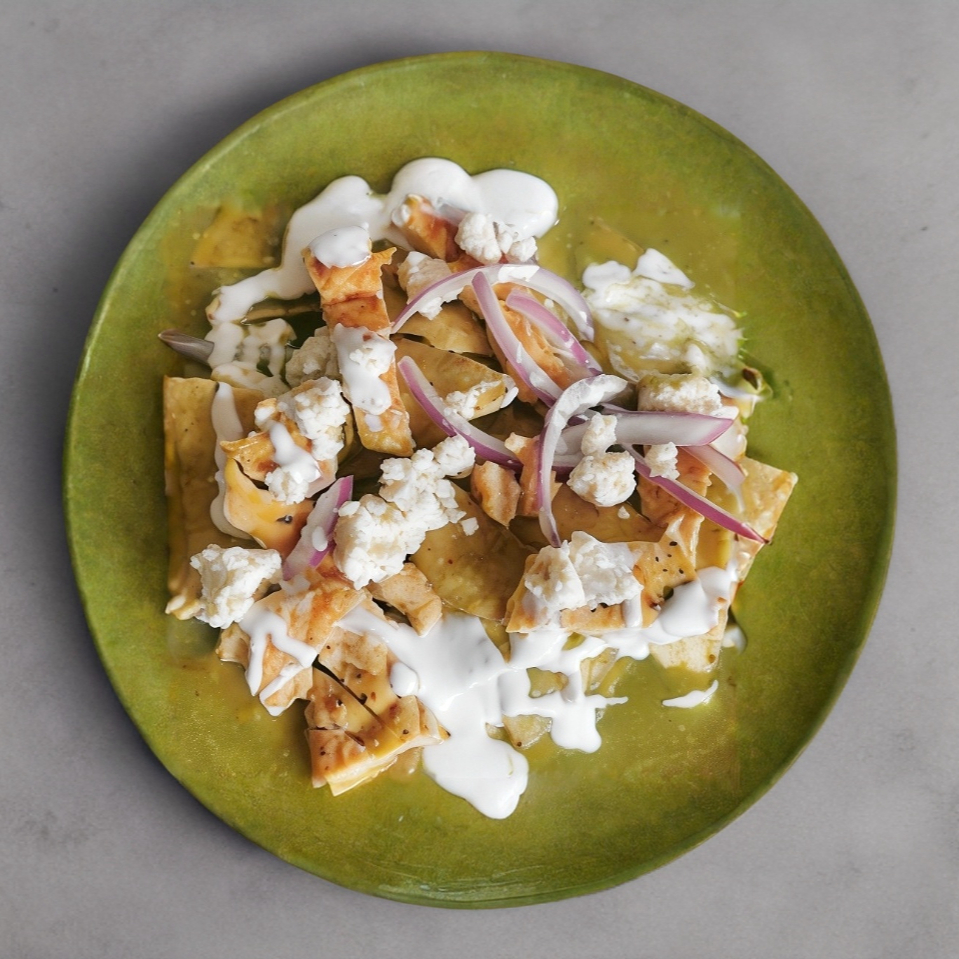 Chilaquiles preparados con salsa de chile pasilla, acompañados de pollo jugoso, aguacate fresco y cebolla morada. Un platillo lleno de sabor y tradición.