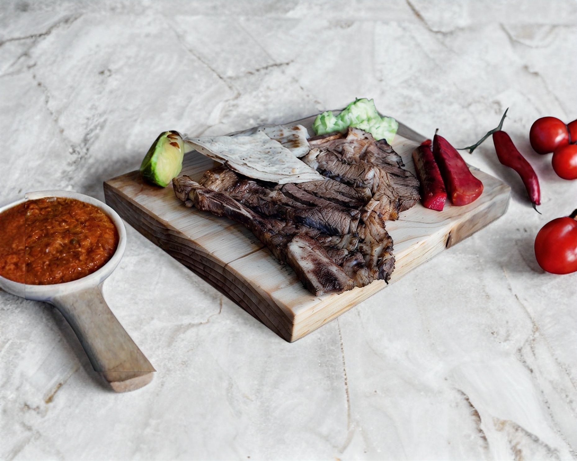 Deliciosa carne marinada, asada al carbón, acompañada de guacamole, salchicha para asar, una quesadilla y tortillas.carn