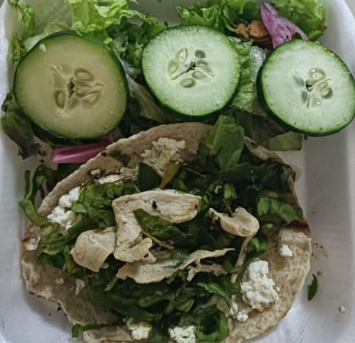 Dos piezas de tortilla de harina integral, requesón, espinaca, pollo a la plancha, pimientos, acompañado de ensalada.
