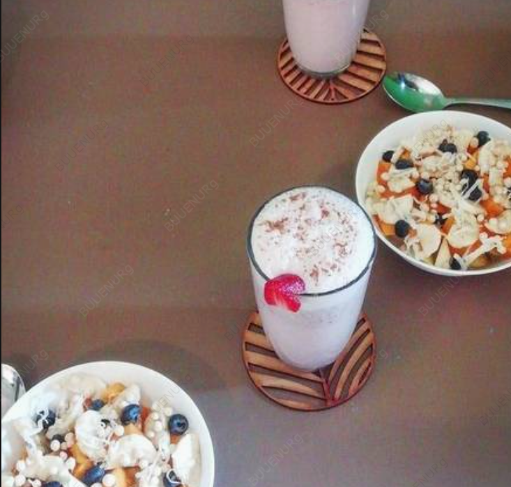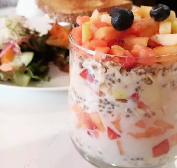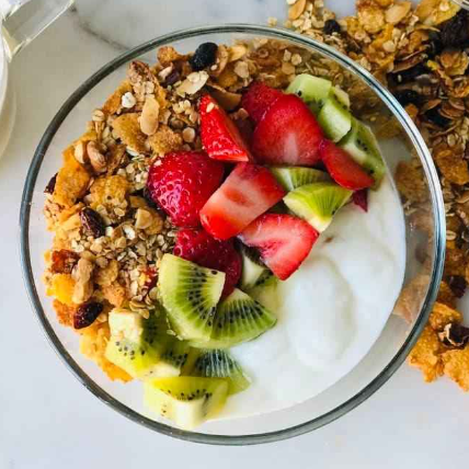 Base de yogurt natural, acompañado de fruta de temporada quinoa inflada y miel.