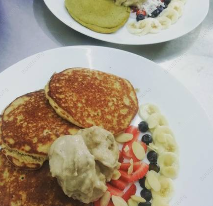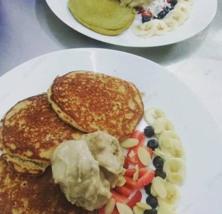 Harina de avena y matcha en polvo, acompañdos con frutos rojos miel maple orgánica, y deliciosa nieve de plátano casera, 4 piezas.