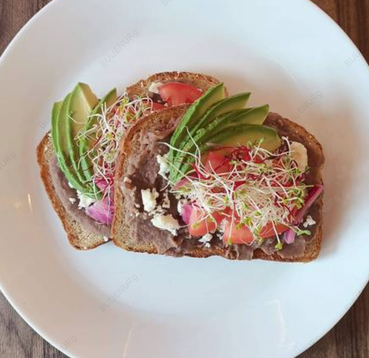 Dos piezas de pan hogaza, servidos con requesón, espinaca, champiñones, semillas de girasol, germinado y pico de gallo.