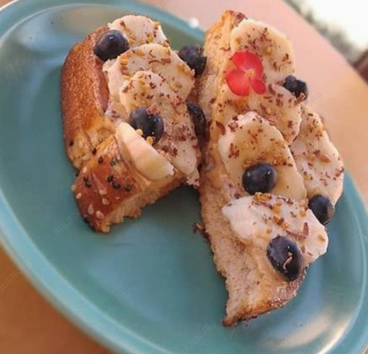 Pan integral, crema de cacahuate casera, plátano rebanado, blueberries, ajonjolí garapañado y miel maple opcional.
