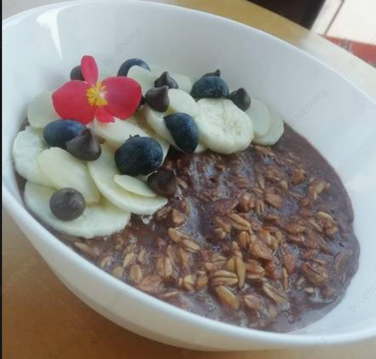 Hojuelas de avena, leche deslantosada, canela, plátano rebanado y cocoa y chispas de chía cubiertas de chocolate. Nuestras bases estan hechas con leche deslactosada pero tú la puedes cambiar por leche vegetal.