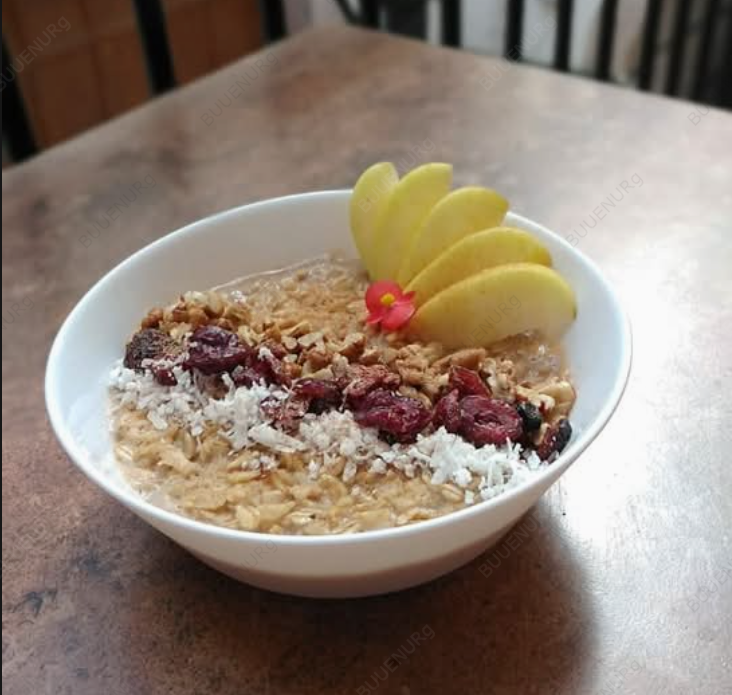 Deliciosa avena cocida, acompañado de manzana verde, nuez, mantequilla de cacahuate casera y canela, cocida con leche deslantosada.