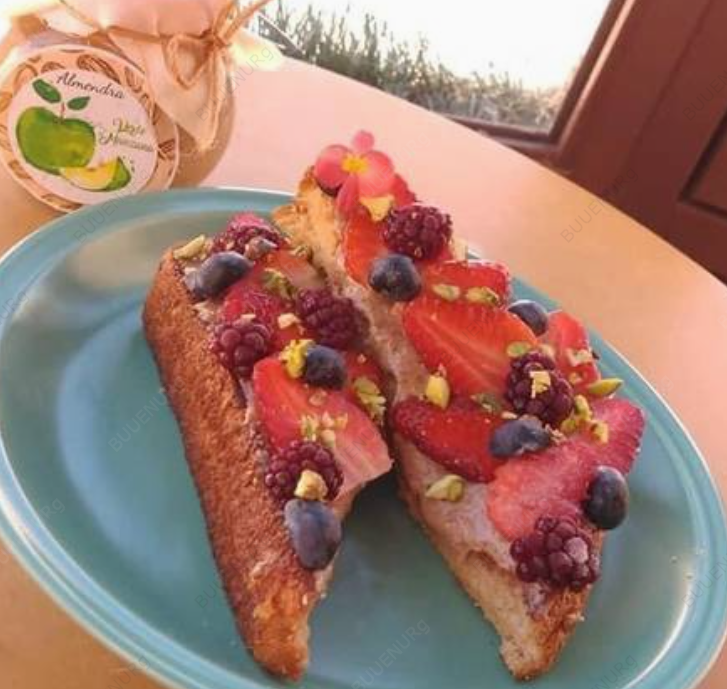 Pan integral bañado en huevi batido, crema de lamendra casera, frutos rojos, semilla de pistache y miel maple opcional.