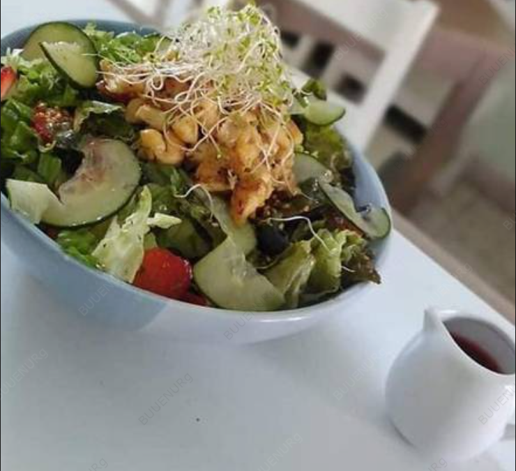 Deliciosa ensalada hecha con una base de lechugas mixtas, acompañada de jitomate cherry, queso panela, pepino, semilla de girasol y una vinagreta de limón.