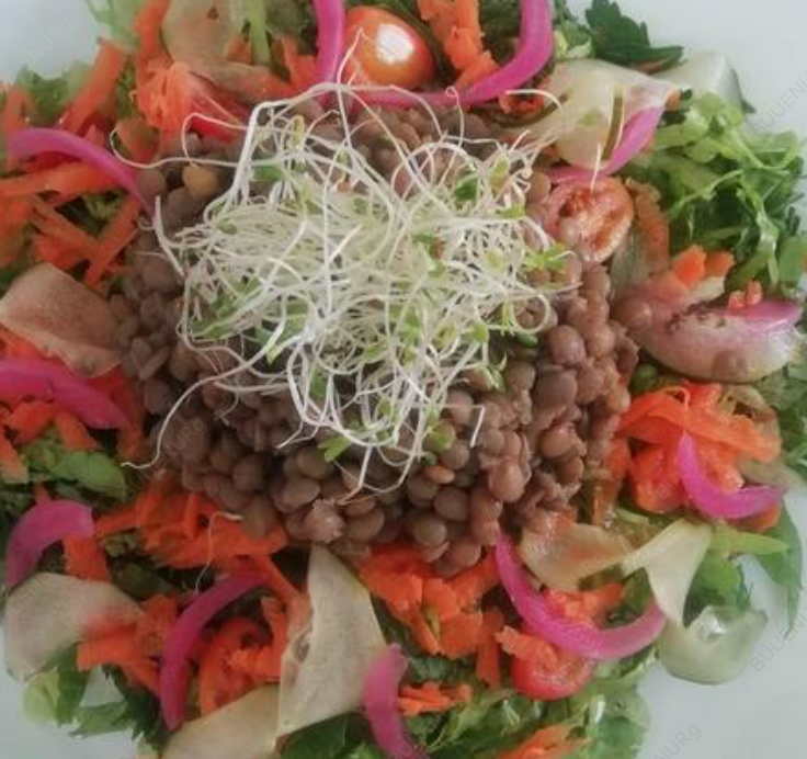 Milanesa de lentejas sazonadas, servidas sobre una cama de lechugas mixtas y espinaca, cebolla, perejil, pepino, zanahoria, jitomate cherry, queso parmesano, vinagreta hierbas finas y limón, vegetariano.