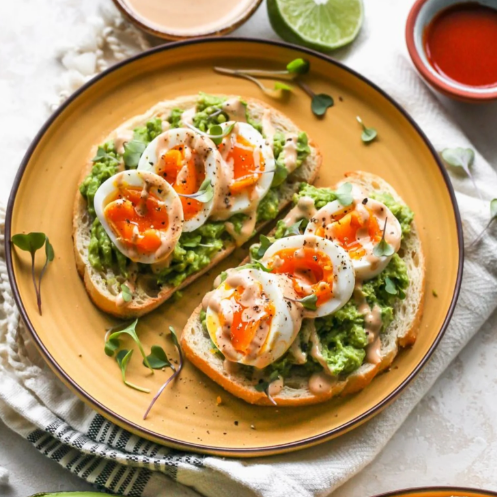 Dos piezas de pan hogaza, cama de aguacate, dos huevos estrellados, semillas de girasol, germinado y pico de gallo.